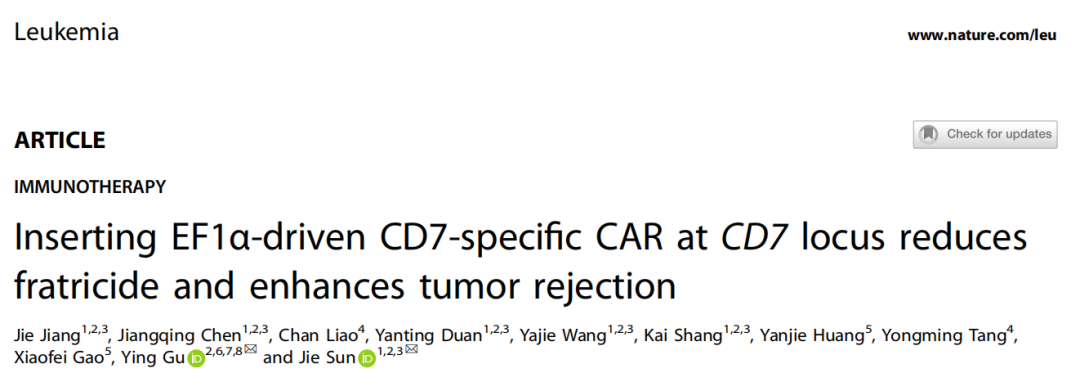 2023年6月30日,浙大醫學院古瑩/孫潔研究團隊在Leukemia (IF 11.4) 發表題為“Inserting EF1α-driven CD7-specific CAR at CD7 locus reduces fratricide and enhances tumor rejection”的研究論文。文章開發了一種“二合一”的策略,通過同時敲除CD7和敲入CD7 CAR,將CD7 CAR直接插入CD7位點,不僅減少了CD7 CAR-T細胞的自相殘殺,而且增強了腫瘤排斥反應,為臨床CAR-T治療T細胞惡性腫瘤提供了新思路。