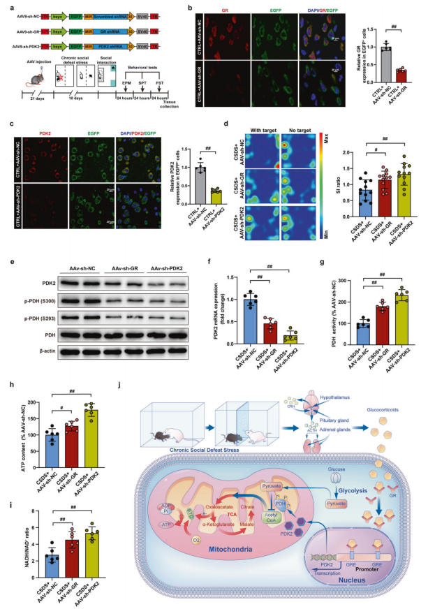 為研究GR或PDK2對PDH活性的作用,作者通過將GR或PDK2的shRNA嵌入miR30結構,并利用AAV載體(AAV9-hSyn-shGR / AAV9-hSyn-shPDK2)在小鼠神經元中特異性敲低GR或PDK2。結果顯示,GR或PDK2特異性敲低的CSDS小鼠的SI高于對照 (AAV9-hSyn-sh-NC)組,表明GR或PDK2阻止了應激敏感性的誘導。GR敲低顯著降低了PDK2 mRNA和蛋白的水平。此外,GR或PDK2敲除顯著降低了Ser293和Ser300殘基的PDH磷酸化。值得注意的是,GR或PDK2抑制對PDH表達沒有影響,但增加了PDH活性。結果顯示,注射AAV9-hSyn-sh-GR-和AAV9-hSyn-sh-PDK2小鼠的ATP含量和NADH/NAD+比值明顯高于對照小鼠。