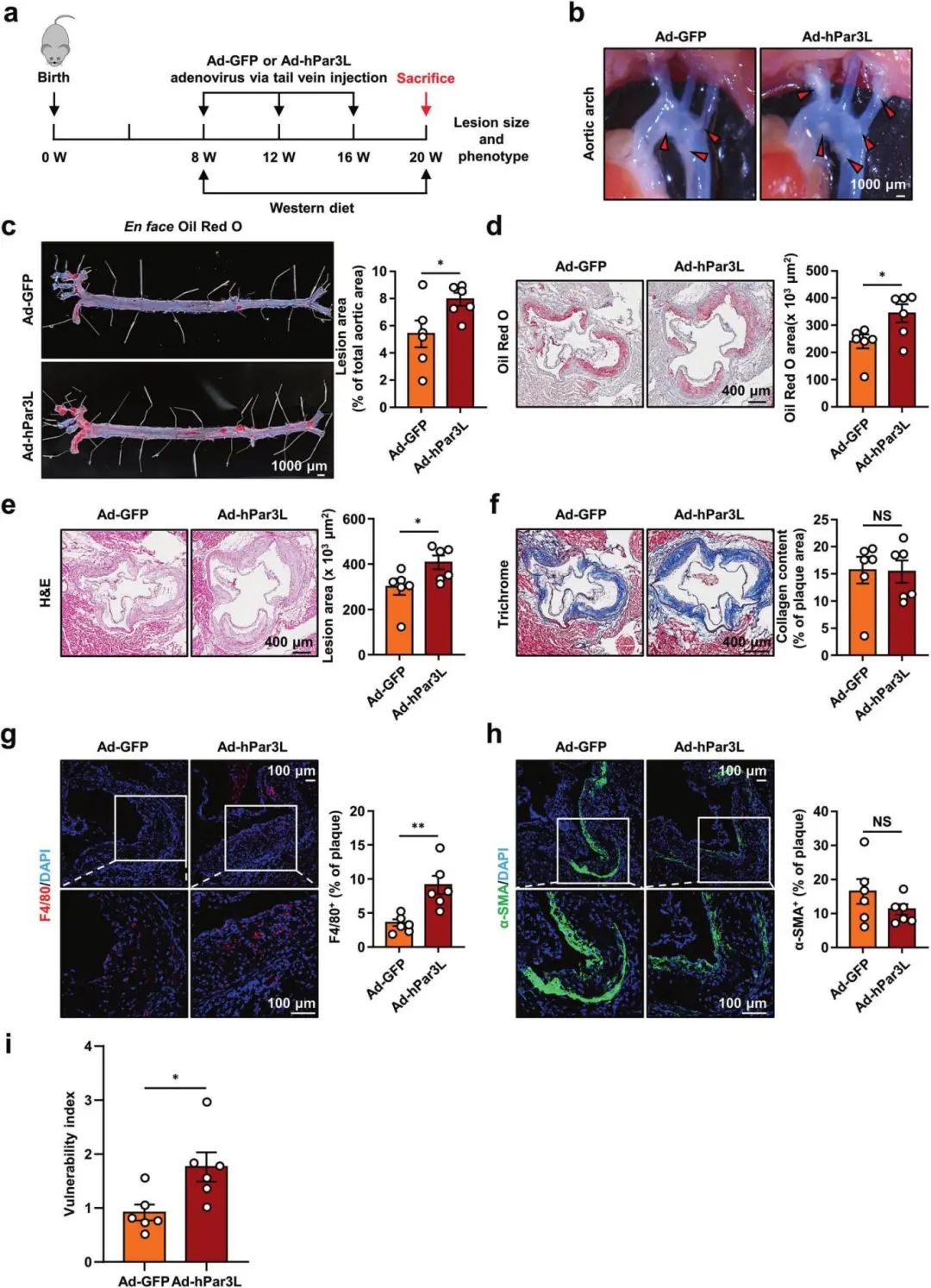 數據表明Par3L在人和小鼠動脈粥樣硬化斑塊中表達顯著上調,并在原代小鼠巨噬細胞中受氧化型低密度脂蛋白oxLDL誘導上調。為進一步評估Par3L對小鼠動脈粥樣硬化發展的影響,作者將Ad-GFP或Ad-hPar3L通過尾靜脈注入Apoe?/?小鼠體內,隨后給予12周西方飲食喂養。與Ad-GFP Apoe?/?小鼠相比,Par3L過表達后主動脈粥樣硬化病變面積和斑塊不穩定性明顯增加,同時巨噬細胞的積累顯著增加。這些數據表明Par3L加速Apoe-/-小鼠體內動脈粥樣硬化斑塊的形成。