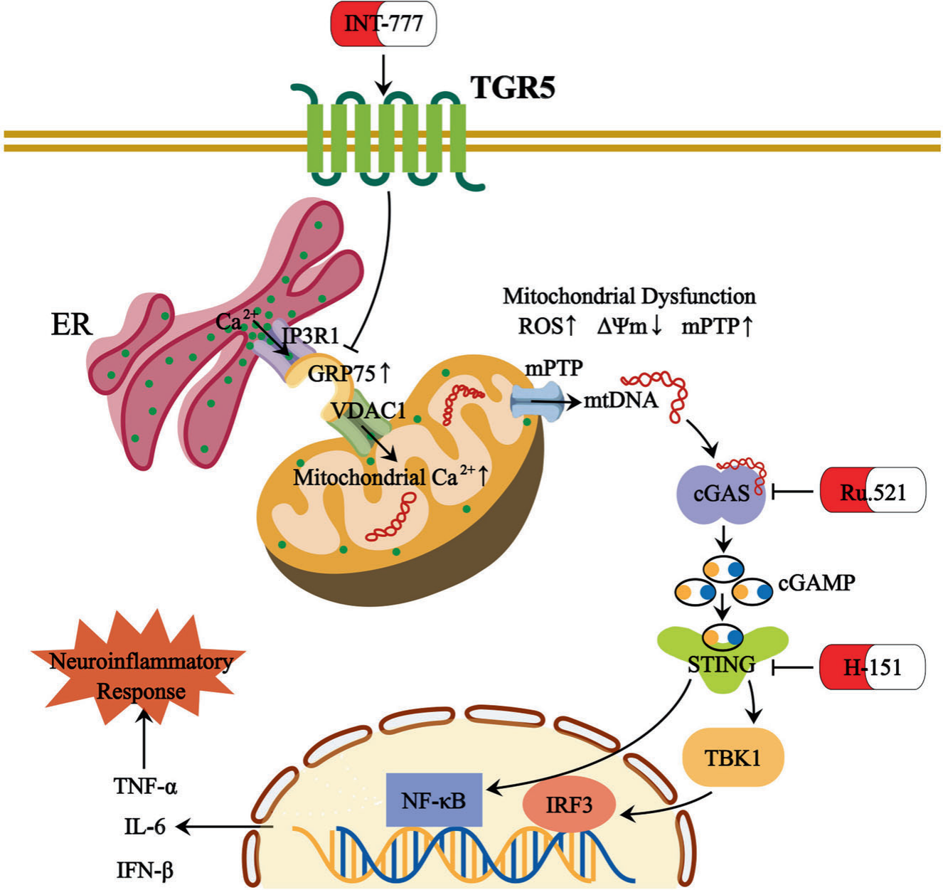 本研究證明了TGR5是維持Müller細胞線粒體功能的關鍵因子。TGR5激動劑下調MAMs形成,從而緩解線粒體Ca2+超負荷誘導的線粒體功能障礙。因此,在DR中,線粒體mtDNA釋放減少,cGAS-STING信號介導的炎癥反應被抑制。綜上,本研究表明TGR5是DR的一個有前途的治療靶點。