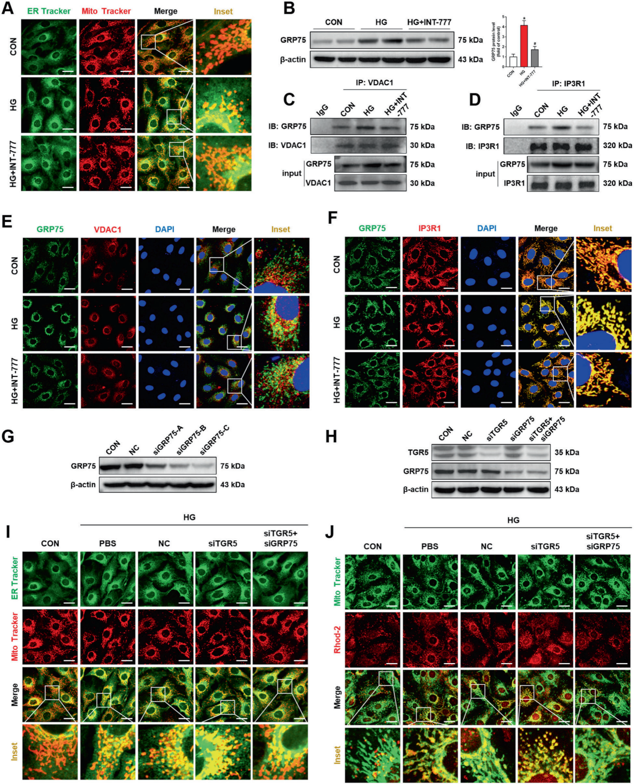 作者進一步研究發現TGR5通過調節線粒體Ca2+水平來調節線粒體功能,MAMs介導Ca2+從內質網向線粒體的外排。HG處理的細胞中,MAM的形成增加,在INT-777處理后,線粒體和內質網之間的共定位顯著減少。因此,作者推測TGR5介導的線粒體Ca2+穩態是由MAMs調節的。IP3R1-GRP75-VDAC1軸被證明存在于MAMs中,負責從內質網到線粒體的Ca2+運輸。GRP75在HG條件下顯著上調,而TGR5的激活逆轉了其升高。免疫共沉淀和免疫熒光顯示HG培養增加了GRP75與VDAC1以及GRP75與IP3R1的結合,而INT-777處理可以抑制這些結合。與HG組相比,TGR5敲低促進了MAM的形成并降低了線粒體Ca2+水平。然而,TGR5沉默對MAM形成和線粒體Ca2+過載的影響被GRP75沉默顯著逆轉。這些發現證實,TGR5抑制GRP75的表達導致IP3R1-GRP75-VDAC1復合物的形成受阻,從而降低線粒體Ca2+水平。