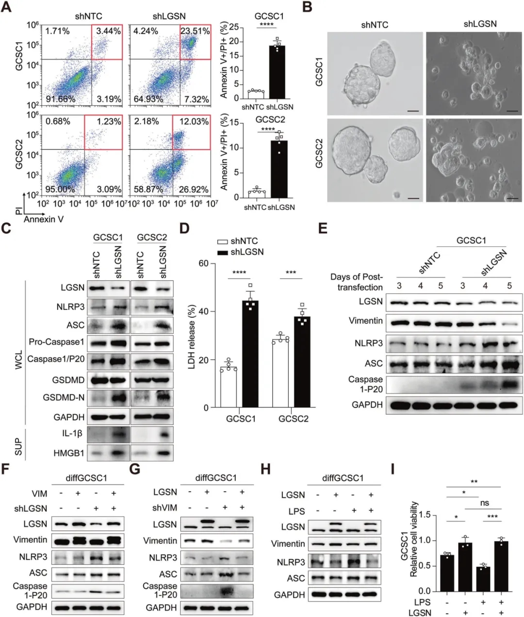 下調LGSN影響了GCSC的自我更新和致瘤性,顯著增加了GCSC的凋亡,作者發現瀕死GCSC經歷了以焦亡為特征的形態學變化,在分子水平上,LGSN敲低促進了NACHT、LRR、NLRP3和ASC蛋白的表達,并伴隨caspase1前體積累、caspase1-P20激活和GSDMD-N的增加,以及IL-1β、HMGB1和LDH的細胞膜釋放。不僅如此,LGSN下調還會損害腫瘤發生、細胞增殖和遷移,vimentin重構或異位表達可逆轉LGSN敲低造成的上述影響。此外,WFA處理的GCSCs也表現出焦亡形態,并且vimentin缺失誘導NLRP3表達,表明vimentin對于LGSN干擾誘導的焦亡至關重要。用NLRP3炎性體激活劑LPS處理LGSN過表達的diffGCSCs, LPS刺激上調了diffGCSC中NLRP3和ASC的表達,而LGSN過表達減弱了LPS誘導的焦亡信號,促進了GCSCs的惡性增殖。上述數據表明在GCSCs中LGSN通過上調vimentin發揮焦亡抑制作用。