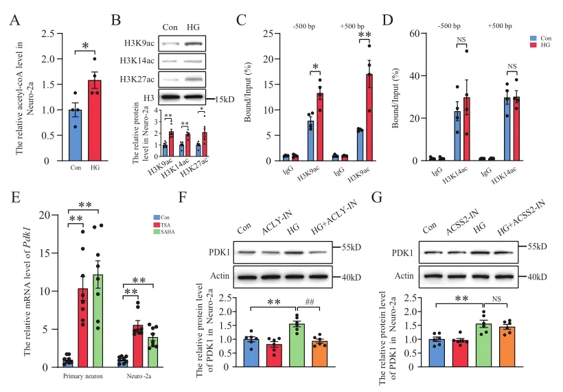 圖1. HG刺激的神經元中,乙酰輔酶A誘導的組蛋白乙酰化介導PDK1的表達