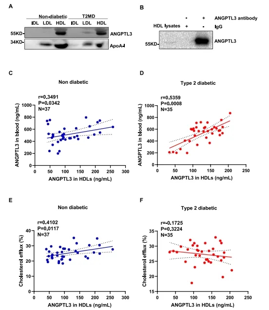 研究者從非糖尿病受試者和T2DM患者的血漿中分離脂蛋白組分,并通過蛋白質印跡法和免疫共沉淀,確定ANGPTL3在很大程度上與HDL結合,并且在非糖尿病受試者中,HDL中的ANGPTL3水平與膽固醇流出的百分比以及低密度脂蛋白呈正相關,但在T2DM患者中沒有。隨后,研究者使用Pearson相關分析檢測了HDL中的的ANGPTL3和HDL其他成分之間的相關性,發現HDL中的ANGPTL3和其他HDL成分(apoA-I)之間的相關性在女性非糖尿病受試者和T2DM患者之間存在差異。在女性非糖尿病受試者中,HDL中的ANGPTL3和apoA-I呈正相關,而在女性T2DM患者中,HDL中的ANGPTL3與apoA-I則呈負相關。
