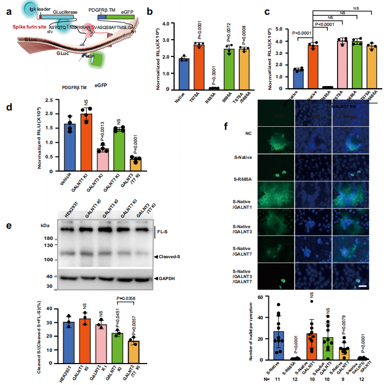 首先,作者分析了新冠病毒刺突蛋白的O-糖基化修飾,發現T678、S686和S689可能是Furin酶附近的潛在糖基化位點,進一步通過體外糖基化反應發現糖基轉移酶GalNAc-T3與T7活性可能與重組刺突蛋白上鑒定的O-糖基化位點(T678、S686和S689)有關。接下來,為確定GalNAc-T3和T7引發的O-糖基化是否能抑制細胞中S蛋白多堿基切割位點的蛋白酶加工,作者構建了一個包含刺突多堿基切割位點蛋白酶加工活性的熒光素酶生物傳感器。結合體外酶活性測定,生物傳感器實驗結果表明,GalNAc-T3和T7在SARS-CoV-2 S蛋白多堿基切割位點上的串聯糖基化修飾能夠抑制細胞內Furin的切割。在合胞體形成測定實驗中,T7在S686位點的糖基化在阻止細胞蛋白酶的蛋白質加工和抑制其融合活性方面起著關鍵作用,這些發現對SARS-CoV-2刺突蛋白的激活具有潛在的意義。