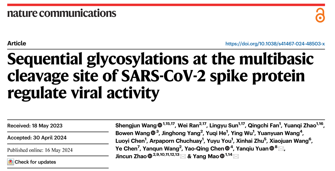 2024年5月16日,中山大學藥學院毛洋教授、袁燕秋副教授聯合廣州醫科大學附屬第一醫院趙金存教授團隊在“Nature Communications,IF 16.6”在線發表題為Sequential glycosylations at the multibasic cleavage site of SARS-CoV-2 spike protein regulate viral activity的論文,研究結果強調了糖基化作為宿主細胞對抗SARS-CoV-2的防御機制的作用,并揭示了宿主與病毒之間的進化相互作用,為開發針對SARS-CoV-2的潛在治療干預策略奠定了理論基礎。