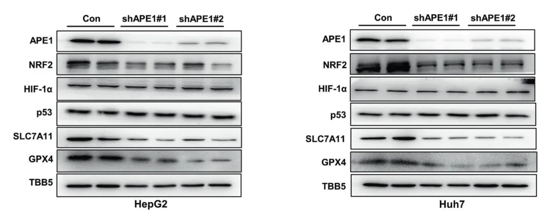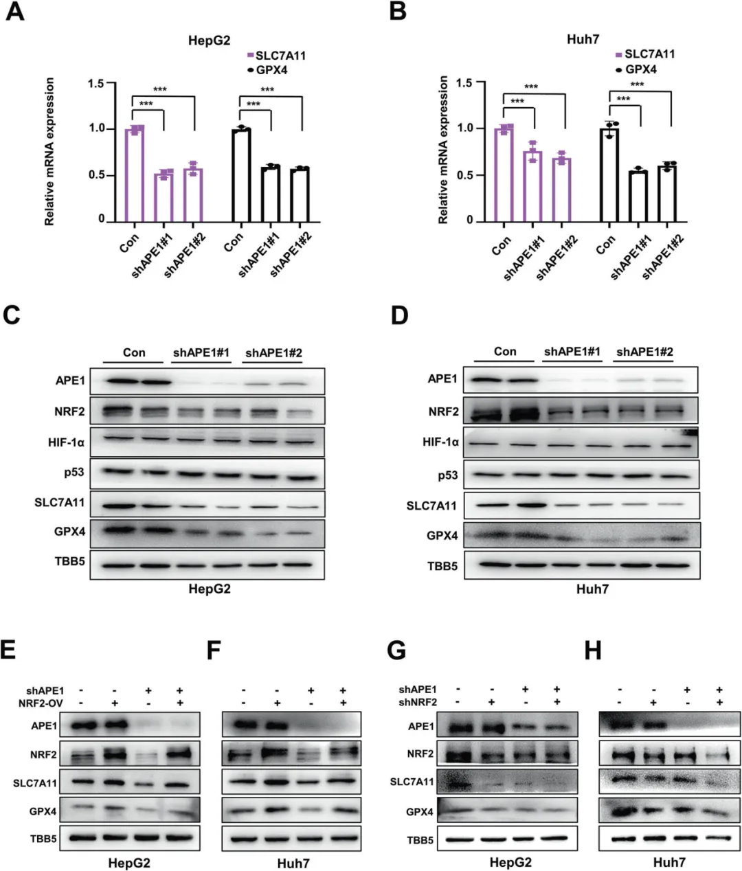 最近的多項研究表明鐵死亡與HCC的發展和治療反應有關,同時脫嘌呤/脫嘧啶核酸內切酶1,APE1在HCC中高水平表達,促進HCC的進展并與其不良預后相關,鑒于此,作者探索了APE1是否參與HCC的鐵死亡。首先,通過建立APE1敲低(APE1-KD)的HCC細胞系,發現APE1的沉默促進了HCC細胞的鐵死亡,進而檢測參與鐵死亡途徑關鍵基因的表達,證實APE1通過NRF2/SLC7111/GPX4軸調節鐵死亡。