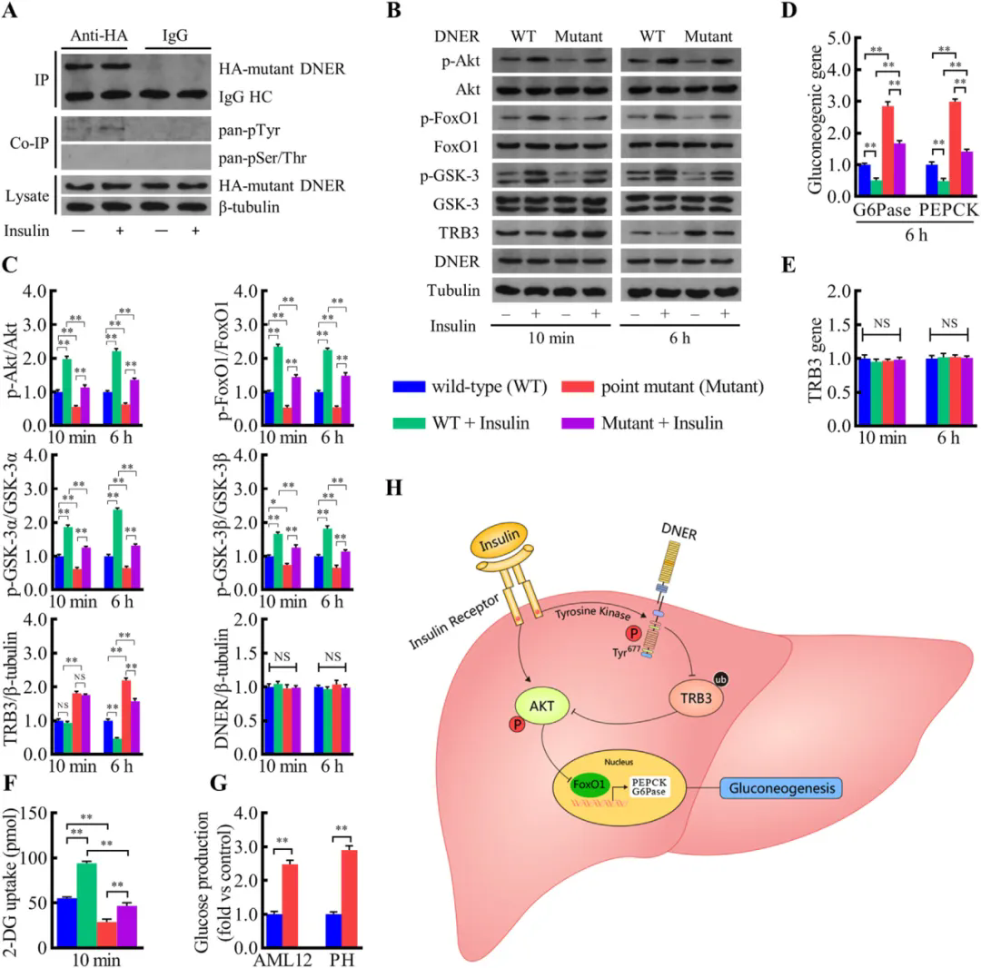 本研究揭示了DNER在增強胰島素刺激的Akt激活和抑制肝細胞糖異生中的新作用,證明了胰島素刺激的DNER Tyr677磷酸化在誘導TRB3的蛋白酶體降解和通過Akt-FoxO1-G6Pase/PEPCK途徑抑制肝糖異生中起著關鍵作用。胰島素刺激Tyr677磷酸化的發現也揭示了DNER和胰島素信號通路之間相互作用的機制。