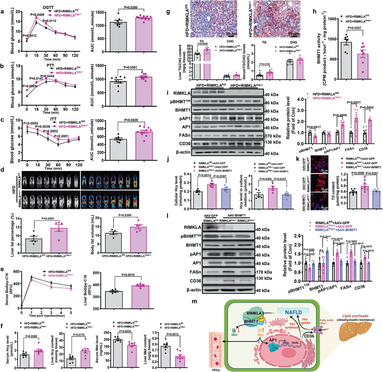 為了進一步證實RIMKLA在調節Hcy和糖/脂代謝中的作用,研究人員構建了肝細胞特異性敲除RIMKLA的小鼠(RIMKLAhep-/-)。HFD喂養8-12周后,RIMKLAhep-/-小鼠表現出比對照組小鼠更嚴重的葡萄糖耐受不良、肝糖生成和胰島素抵抗,脂肪含量和總脂肪體積更高。此外,RIMKLAhep-/-小鼠的脂質攝取率高于對照組小鼠。肝細胞中RIMKLA的缺失導致血清和肝臟中Hcy水平升高,Met水平降低;在肝臟和血清CHO水平不變的情況下,RIMKLAhep-/-小鼠的肝臟脂質沉積更為嚴重。RIMKLAhep-/-小鼠肝臟中BHMT1的磷酸化和酶活性降低,而其蛋白水平保持不變,磷酸化的AP1、FASn和CD36表達增加。與對照小鼠肝細胞相比,培養的RIMKLAhep-/-小鼠肝細胞中Hcy水平、AP1磷酸化、FASn和CD36表達以及脂質沉積增加,但被BHMT1過表達所拯救。以上表明肝細胞特異性RIMKLA缺失會加重HFD小鼠的HHcy、高血糖和脂肪變性。