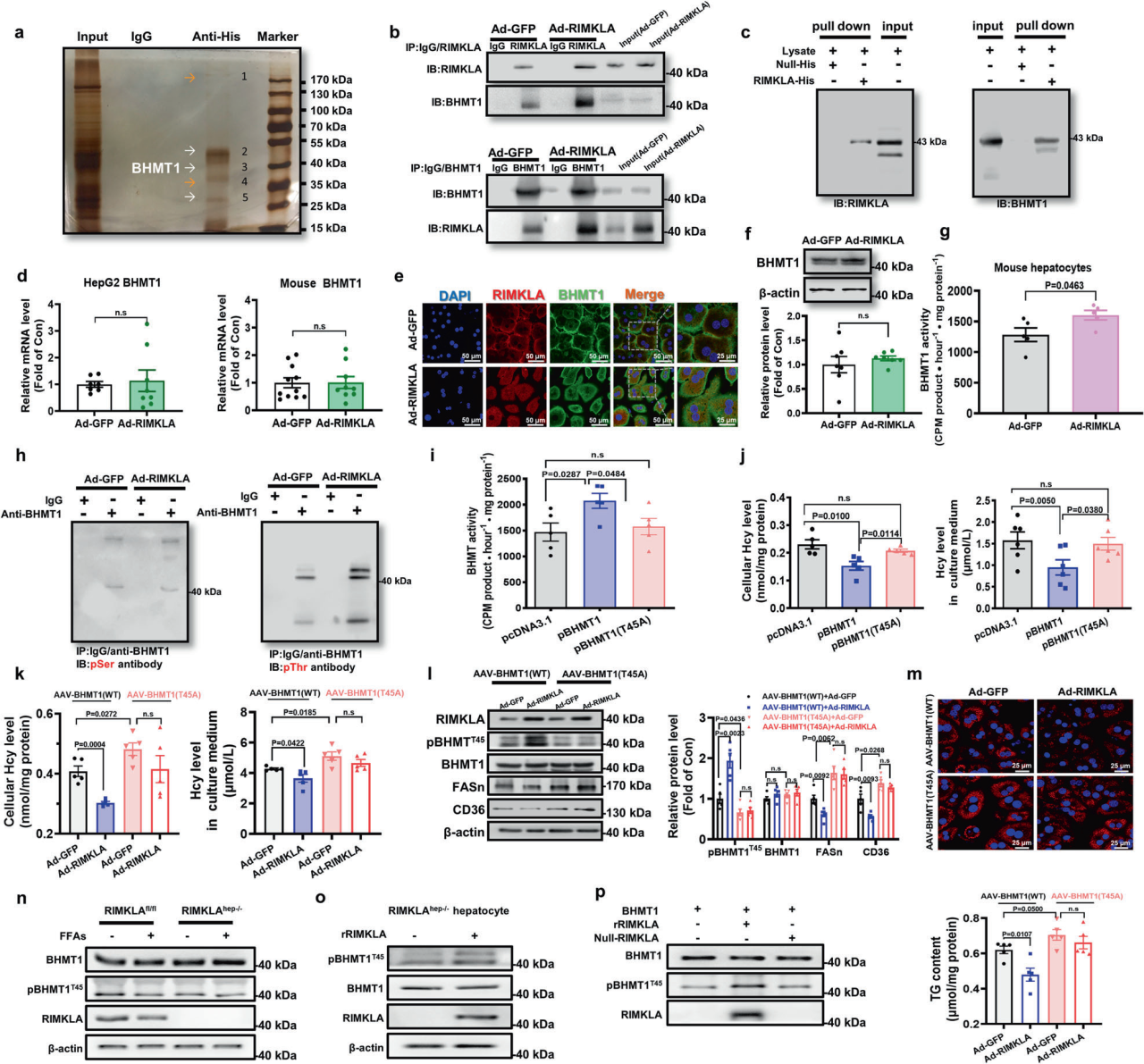 圖3.RIMKLA通過磷酸化肝細胞中的Thr45位點與BHMT1相互作用并激活BHMT1