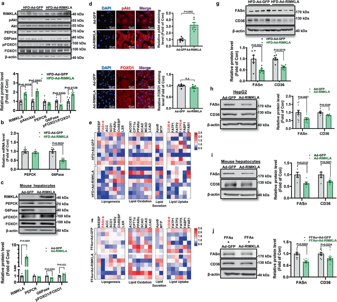 在糖尿病小鼠肝臟中,注射Ad-或AAV8-RIMKLA可使RIMKLA蛋白水平升高約2倍。RIMKLA過表達增加小鼠肝臟中蛋白激酶B (Akt)磷酸化,降低葡萄糖6磷酸酶(G6Pase) mRNA和蛋白水平。在小鼠肝細胞和HepG2細胞中,RIMKLA過表達增加了磷酸化Akt ( pAkt )的核分布,促進了叉頭框蛋白O1 ( FOXO1 )的核排斥,并降低了G6Pase的表達。為了研究RIMKLA在脂質代謝中的作用機制,研究人員評估了RIMKLA過表達對脂質代謝關鍵基因mRNA水平的影響。在RIMKLA過表達后,HFD小鼠肝臟和FFA誘導的肝細胞中,FASn(關鍵脂肪生成基因之一)和CD36(關鍵脂肪酸轉運蛋白之一)的mRNA水平均持續降低;同時,RIMKLA過表達降低了肥胖小鼠肝臟、人HepG2細胞和小鼠肝細胞中的FASn和CD36蛋白水平。此外,在FFAs存在的情況下,RIMKLA過表達也降低了小鼠肝細胞中FASn和CD36蛋白水平,表明RIMKLA過表達減少了FFA促進的脂質沉積。以上數據表明,RIMKLA過表達通過抑制脂質從頭合成和脂質攝取改善肝臟脂質沉積,并通過抑制FOXO1抑制糖異生。