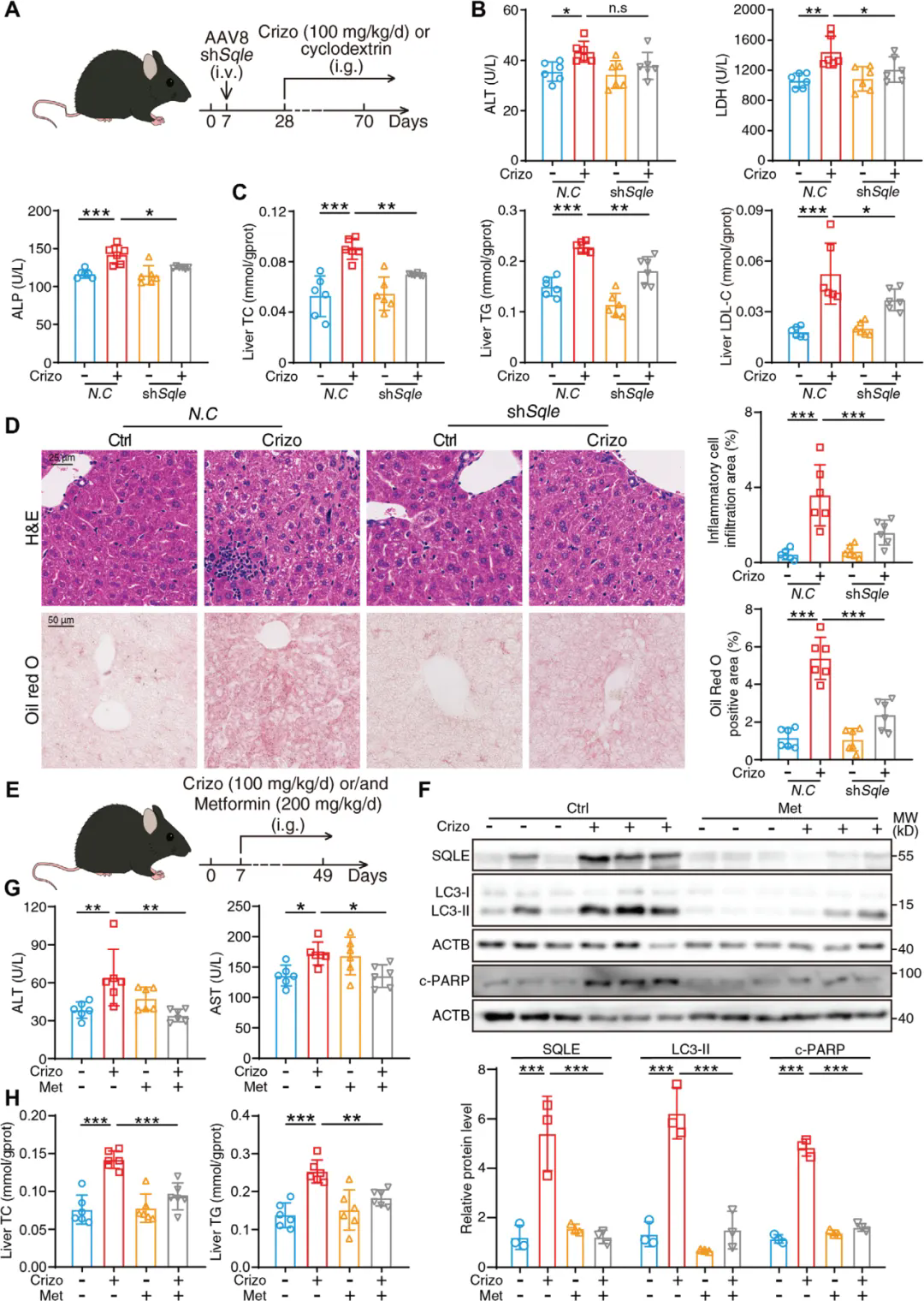 本研究揭示了克唑替尼肝毒性主要由膽固醇代謝異常、細胞凋亡和自噬阻斷引起,SQLE積累起關鍵作用。二甲雙胍和特比萘芬可改善肝毒性,為臨床安全用藥提供策略,也為相關疾病治療提供了新思路。