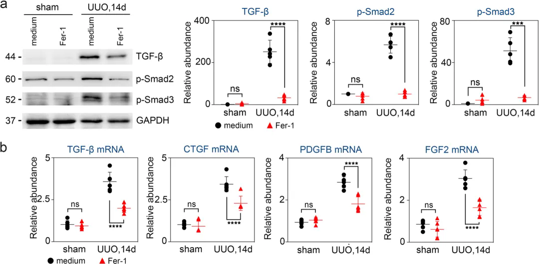 通過構建單側輸尿管梗阻(UUO)小鼠模型,研究發現鐵死亡在腎小管上皮細胞(TECs)中持續發生,且與腎間質纖維化進程密切相關;對UUO小鼠使用鐵死亡抑制劑Fer-1,結果表明抑制鐵死亡能有效緩解腎纖維化。此外,Fer-1處理后,梗阻腎臟中TGF-β及其關鍵下游效應物p-Smad2、p-Smad3,以及CTGF、PDGFB和FGF2的水平顯著降低,表明Fer-1通過抑制TGF-β/Smad信號通路,減少了促纖維化細胞因子的釋放,進而減輕了腎間質纖維化。體外實驗進一步驗證Fer-1能有效改善TGF-β誘導的HK-2細胞鐵死亡積累并緩解細胞纖維化。上述結果證實鐵死亡在腎纖維化過程中起著關鍵作用,它通過持續激活 TGF-β/Smad信號通路,促進下游促纖維化因子的釋放,最終導致纖維化的發生,而抑制鐵死亡可以有效減輕TGF-β誘導的纖維化反應。