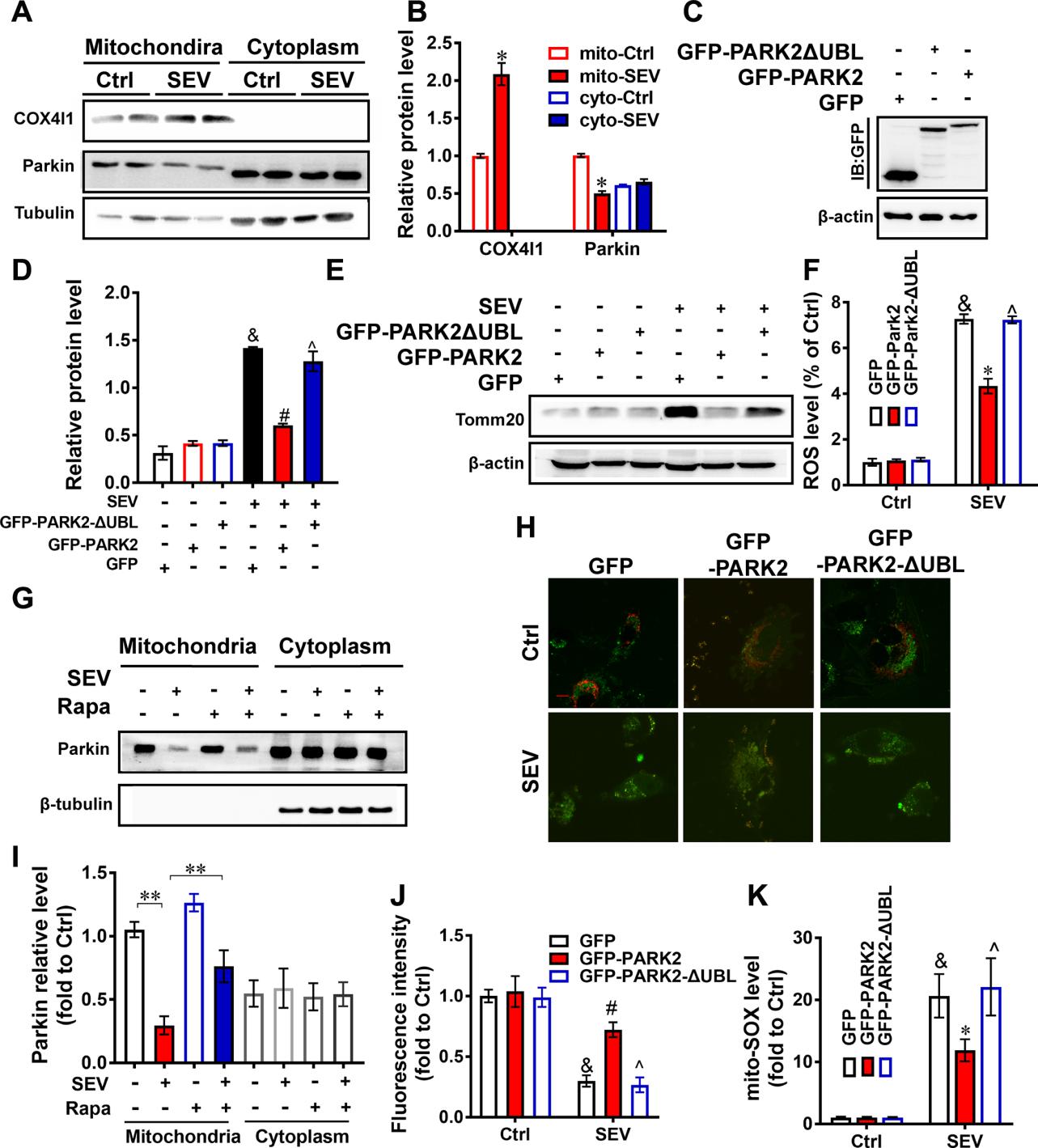 最后,為了(le)闡明(ming)七氟醚(mi)誘導(dao)線(xian)(xian)(xian)粒(li)(li)(li)(li)體(ti)(ti)自(zi)(zi)噬(shi)(shi)功(gong)能(neng)障(zhang)礙的可(ke)能(neng)機(ji)制(zhi),作者對(dui)Cox4l1(細(xi)胞(bao)色素(su)氧化(hua)酶)和Parkin蛋白在(zai)線(xian)(xian)(xian)粒(li)(li)(li)(li)體(ti)(ti)和細(xi)胞(bao)質中的積累進行(xing)了(le)檢測(ce)。WB結果(guo)表(biao)明(ming),mito-SEV組(zu)Parkin蛋白表(biao)達量低(di)于(yu)mito-Ctrl組(zu)。將(jiang)EGFP-PARK2 質粒(li)(li)(li)(li)轉染H4細(xi)胞(bao),發現胞(bao)內及線(xian)(xian)(xian)粒(li)(li)(li)(li)體(ti)(ti)內ROS水平降低(di),并且線(xian)(xian)(xian)粒(li)(li)(li)(li)體(ti)(ti)自(zi)(zi)噬(shi)(shi)增強,同時由七氟醚(mi)引起(qi)的的線(xian)(xian)(xian)粒(li)(li)(li)(li)體(ti)(ti)自(zi)(zi)噬(shi)(shi)功(gong)能(neng)障(zhang)礙得到緩解。這些結果(guo)表(biao)明(ming),七氟醚(mi)通過抑(yi)制(zhi)PARK2的表(biao)達影響線(xian)(xian)(xian)粒(li)(li)(li)(li)體(ti)(ti)正常自(zi)(zi)噬(shi)(shi)功(gong)能(neng)(圖6)。