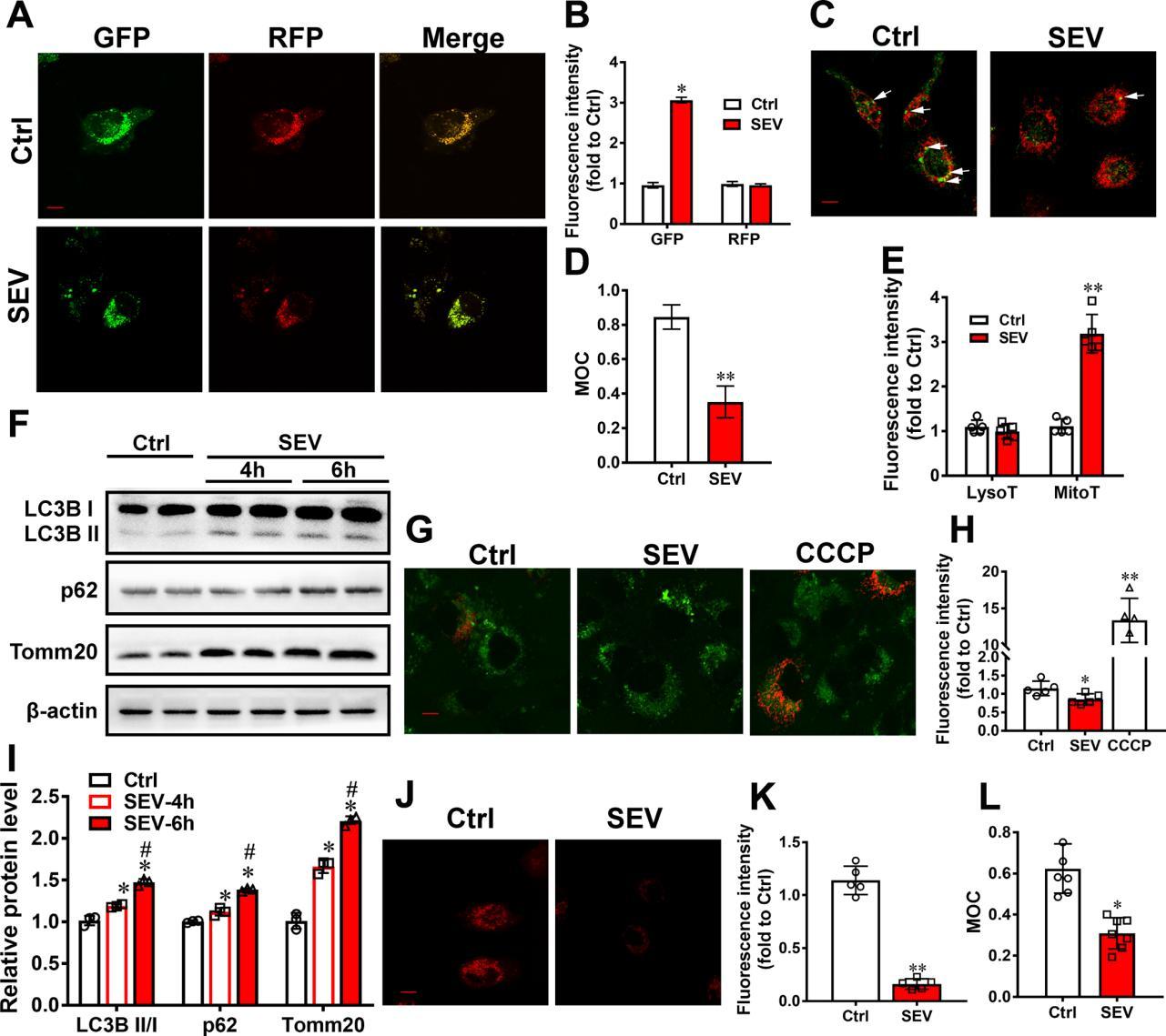 為探(tan)討七(qi)(qi)氟(fu)醚是否會影(ying)響線(xian)(xian)粒(li)體(ti)(ti)自(zi)(zi)(zi)噬(shi)過程,將AdM-CMV-mCherry-EGFP-LC3B轉(zhuan)染H4細胞(bao),免(mian)疫熒光(guang)(guang)(guang)定(ding)量表(biao)明(ming),SEV組(zu)(zu)GFP的(de)熒光(guang)(guang)(guang)強(qiang)(qiang)度(du)強(qiang)(qiang)于對照組(zu)(zu),但RFP的(de)熒光(guang)(guang)(guang)強(qiang)(qiang)度(du)沒有差異(yi)(表(biao)明(ming)自(zi)(zi)(zi)噬(shi)過程受(shou)阻)。使用mt-Keima測(ce)量線(xian)(xian)粒(li)體(ti)(ti)自(zi)(zi)(zi)噬(shi)通(tong)量,加入線(xian)(xian)粒(li)體(ti)(ti)自(zi)(zi)(zi)噬(shi)誘導劑CCCP時(shi),H4細胞(bao)的(de)紅(hong)色熒光(guang)(guang)(guang)增(zeng)強(qiang)(qiang),表(biao)明(ming)線(xian)(xian)粒(li)體(ti)(ti)自(zi)(zi)(zi)噬(shi)被誘導。SEV組(zu)(zu)與(yu)對照組(zu)(zu)相比具有較低的(de)紅(hong)色熒光(guang)(guang)(guang),這說明(ming)七(qi)(qi)氟(fu)醚抑制了H4細胞(bao)線(xian)(xian)粒(li)體(ti)(ti)自(zi)(zi)(zi)噬(shi)功能。MitoTracker(紅(hong)色熒光(guang)(guang)(guang)指(zhi)示)和LysoTracker(綠色熒光(guang)(guang)(guang)指(zhi)示)實(shi)驗結果表(biao)明(ming),七(qi)(qi)氟(fu)醚處理后H4細胞(bao)中(zhong)(zhong)線(xian)(xian)粒(li)體(ti)(ti)數量增(zeng)加,而溶(rong)酶(mei)體(ti)(ti)數量未發生變(bian)化。此外(wai),H4細胞(bao)中(zhong)(zhong)DQ-BSA熒光(guang)(guang)(guang)強(qiang)(qiang)度(du)顯著降低,表(biao)明(ming)溶(rong)酶(mei)體(ti)(ti)功能受(shou)損。WB法檢測(ce)原代培養神經元 LC3B、p62和Tomm20的(de)蛋(dan)白水(shui)平,發現與(yu)Ctrl組(zu)(zu)相比, SEV組(zu)(zu)的(de)三種蛋(dan)白表(biao)達(da)水(shui)平均較高。(圖3)。