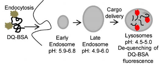 DQ-BSA染料:一(yi)種被熒光(guang)染料標(biao)記的(de)(de)自淬的(de)(de)蛋(dan)白質,一(yi)旦(dan)進入溶酶體(ti),DQ-BSA就(jiu)會被溶酶體(ti)蛋(dan)白酶裂解,導致熒光(guang)片段的(de)(de)不(bu)淬滅和釋放,發出明亮的(de)(de)熒光(guang)。因此,DQ-BSA可用來(lai)指示溶酶體(ti)的(de)(de)功(gong)能是否正常(chang)。