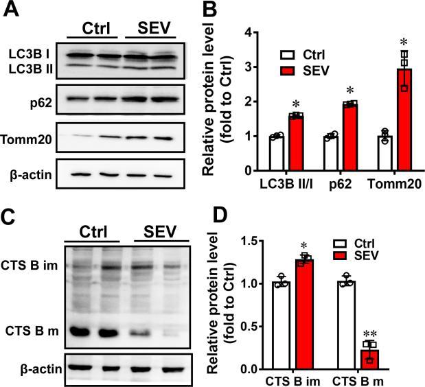 體(ti)內實驗檢測老年大鼠海(hai)(hai)馬中(zhong)SEV-6h組LC3BII/I、p62和(he)Tomm20三(san)種蛋白的表達(da)同樣上調,并且七(qi)氟醚處理后老齡大鼠海(hai)(hai)馬區cathepsin B(溶酶體(ti)組織(zhi)蛋白酶B,參與(yu)自噬降解(jie) )表達(da)水平顯著(zhu)降低,而(er)且成(cheng)熟形式的cathepsin B幾乎消失(shi)(圖(tu)4)。