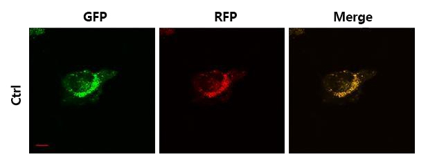 mCherry-EGFP-LC3B雙熒光指示體系:GFP熒(ying)(ying)光(guang)(guang)蛋(dan)(dan)白是酸敏感型蛋(dan)(dan)白,而mCherry是穩定的(de)熒(ying)(ying)光(guang)(guang)表(biao)達基團。自噬形(xing)成(cheng)(cheng)時,mCherry-GFP-LC3融(rong)合蛋(dan)(dan)白轉移(yi)至自噬體(ti)膜,在(zai)熒(ying)(ying)光(guang)(guang)顯微鏡下形(xing)成(cheng)(cheng)多個(ge)明亮的(de)黃色(se)熒(ying)(ying)光(guang)(guang)斑點(dian)。當(dang)自噬溶酶體(ti)形(xing)成(cheng)(cheng)后,酸性(xing)的(de)溶酶體(ti)環境(jing)使GFP熒(ying)(ying)光(guang)(guang)淬滅,mCherry熒(ying)(ying)光(guang)(guang)不受影響,自噬溶酶體(ti)呈現紅色(se)熒(ying)(ying)光(guang)(guang)。因(yin)此,通過mCherry-EGFP-LC3B雙熒(ying)(ying)光(guang)(guang)指示(shi)體(ti)系可以非(fei)常有效地(di)追蹤自噬過程(cheng)。