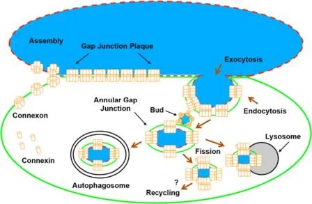 已有研究證明連接蛋白在內質網中合成,在高爾基體中加工形成半通道。新合成的連接蛋白組裝成連接子,隨后被運輸并插入到質膜中。在細胞接觸過程中,連接子與對應細胞的連接子正面對接并聚集形成縫隙連接斑塊。一旦細胞間通訊不再需要縫隙連接斑塊,或細胞遷移,縫隙連接斑塊的一部分(通常是中心部分)或整個斑塊內化,形成環狀縫隙連接。環狀縫隙連接可以通過一系列過程降解,包括溶酶體、自噬體等過程。環狀縫隙連接囊泡或在環狀縫隙連接囊泡降解過程中釋放的連接蛋白可能會回到細胞表面循環利用,參與新的或現有縫隙連接斑塊的形成(圖4)。