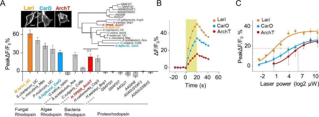 作者還進一步優化了PARIS系統,通過生物信息學篩選出了比ArchT膜轉運性能更優異、光靈敏度更強(約25倍)的新質子泵Lari,擴展了PARIS系統在未來體內應用的前景(圖11)。