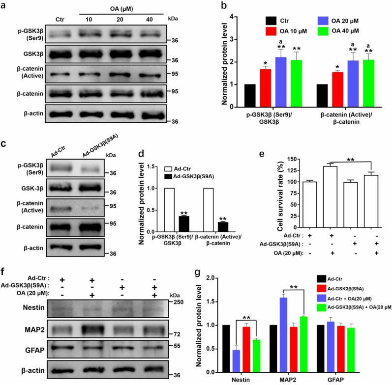 首先,作者通過神經球形成實驗證明OA增加NSCs的遷移;通過CCK-8實驗和神經球形成實驗證實了OA促進NSCs的增殖;通過western blot和免疫熒光實驗揭示了OA促進NSCs分化為神經元。接著,作者通過分子對接表明GSK3β是OA作用的直接靶基因。最后,作者通過western blot和構建非磷酸化突變體(維真生物助力腺病毒)揭示了本論文主題,實驗結果見圖5。