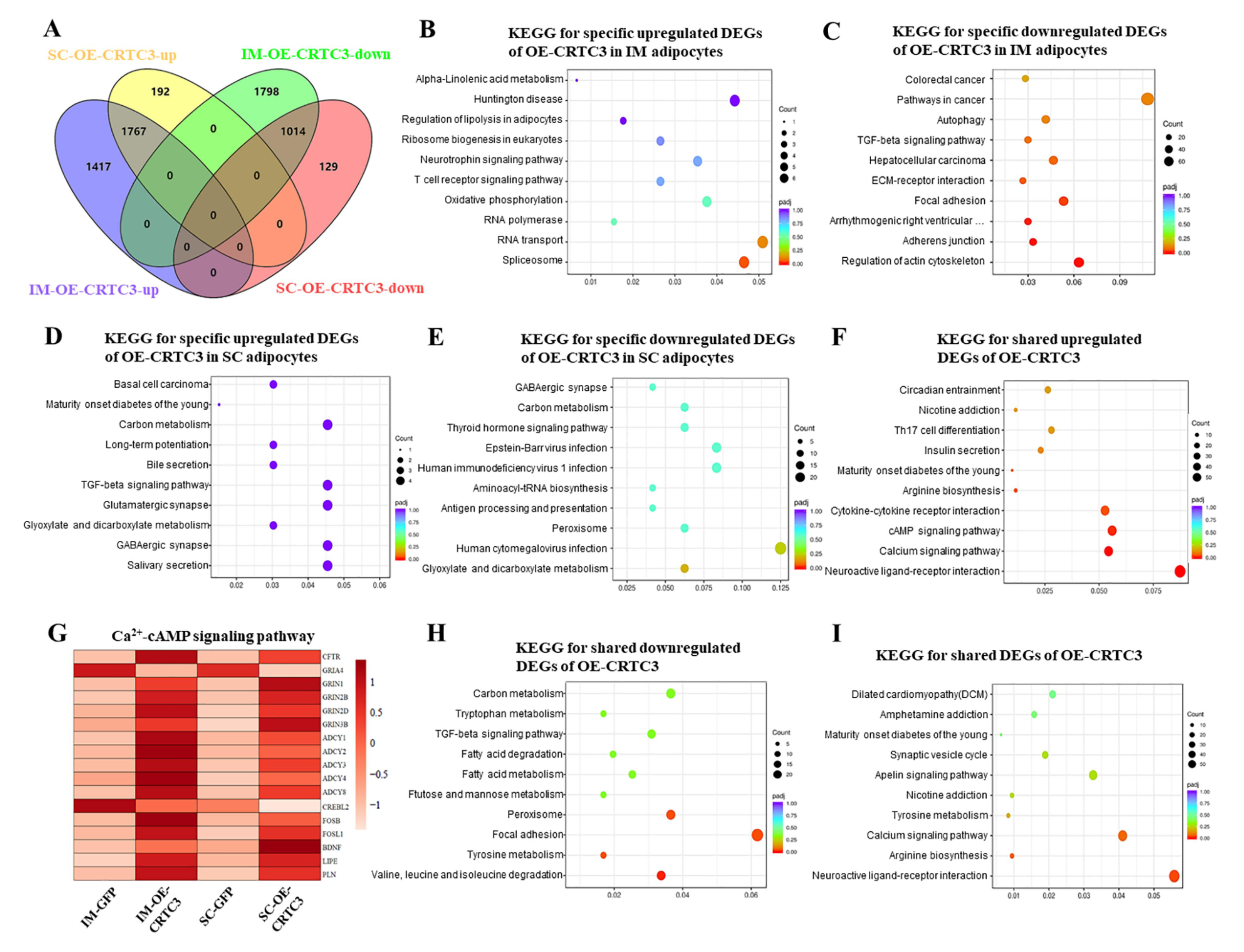 接著,研究者比較了CRTC3過表達的IM和SC脂肪細胞中的DEG,發現CRTC3過表達顯著上調了Ca2+/cAMP信號通路相關的DEG,且KEGG分析表明在SC和IM脂肪細胞中過表達CRTC3時,鈣信號通路起了重要作用。
