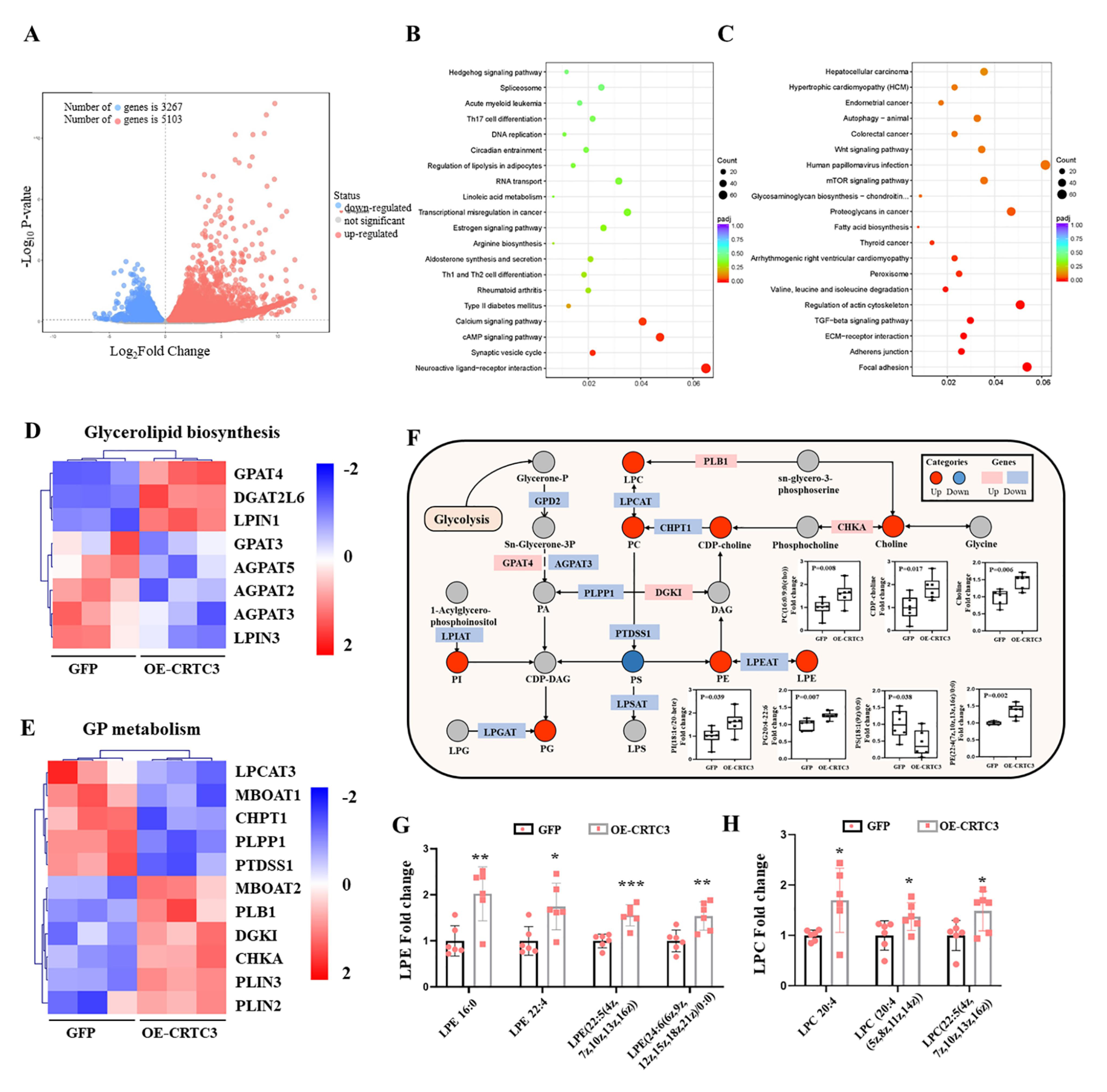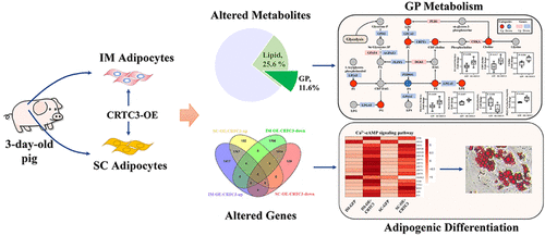 首先,從三日齡的豬中分離出肌內(IM)和皮下(SC)脂肪細胞,利用腺病毒對CRTC3基因進行過表達和干擾。應用非靶向代謝組學分析脂肪細胞中代謝物的變化,通過質譜等方法鑒定出顯著改變的代謝物,對其中變化更顯著的脂質代謝物的亞類進行分析。利用RNA seq闡明IM脂肪細胞的轉錄變化并繪制與代謝相關的路徑圖,確定差異表達基因(DEG),揭示CRTC3參與脂質代謝和成脂分化的調控途徑。