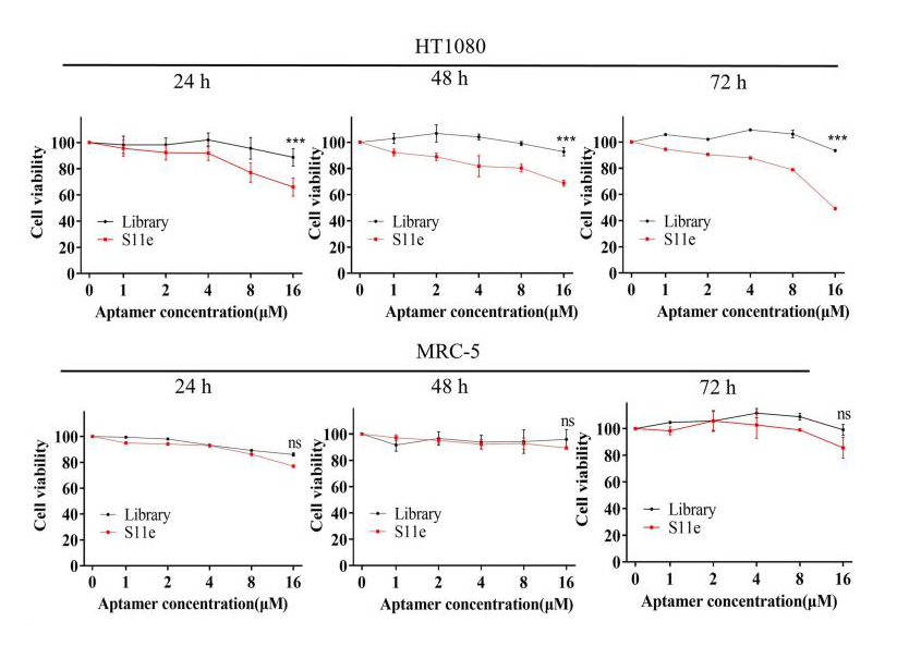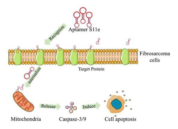 在本研究中,作者發現核酸適體S11e能夠識別纖維肉瘤細胞(HT1080),并且S11e能在HT1080異種移植小鼠模型和纖維肉瘤患者的腫瘤組織中識別腫瘤。此外,作者還證實了S11e不依賴于溶酶體途徑而內化到HT1080細胞中,并位于線粒體中。不僅如此,還發現S11e促進了HT1080細胞的凋亡,并抑制了HT1080細胞的遷移。最后,作者利用質譜方法研究了S11e的生物功能細胞靶點,發現Diablo/ SMAC蛋白是S11e的細胞結合蛋白,通過與S11e相互作用抑制HT1080細胞的遷移和侵襲。綜上所述,這些結果表明S11e可能有助于纖維肉瘤的早期診斷、靶向治療和預后。