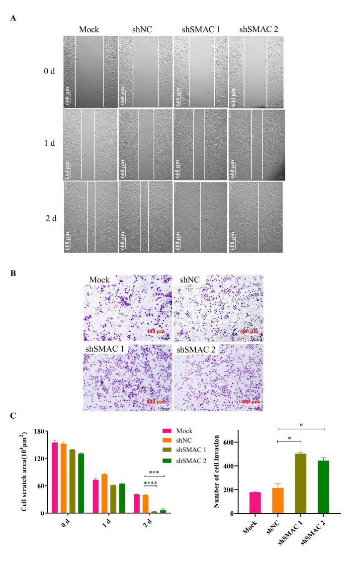 作者還對經S11e處理的Diablo/SMAC沉默的HT1080細胞進行了細胞劃痕和侵襲實驗。結果表明,SMAC的表達降低后,S11e對HT1080細胞遷移和侵襲的抑制作用被消除,上述結果證實,SMAC是纖維肉瘤細胞中S11e的功能性結合靶點。