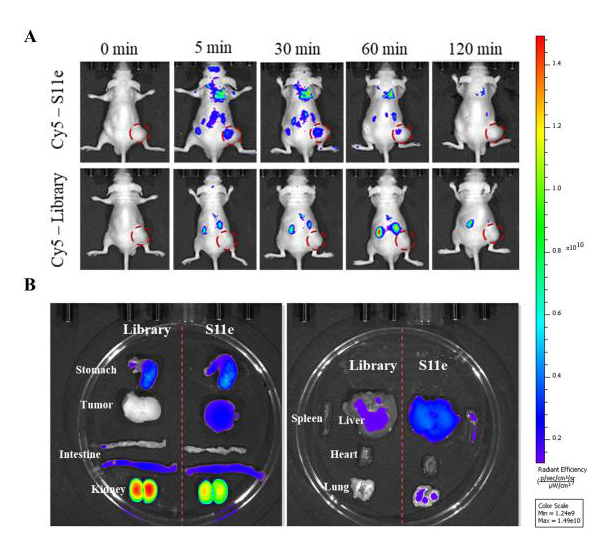 核酸適體識別體內腫瘤的能力是評價能否應用于臨床的重要指標。為此作者將修飾后的核酸適體通過尾靜脈注射小鼠,發現注射后5min,S11e在腫瘤部位的熒光信號增強,而Library在腫瘤部位未見明顯熒光信號,說明S11e在腫瘤部位聚集。通過觀察Cy5標記的S11e在小鼠體內的生物學分布,發現S11e在體內具有靶向纖維肉瘤的能力。