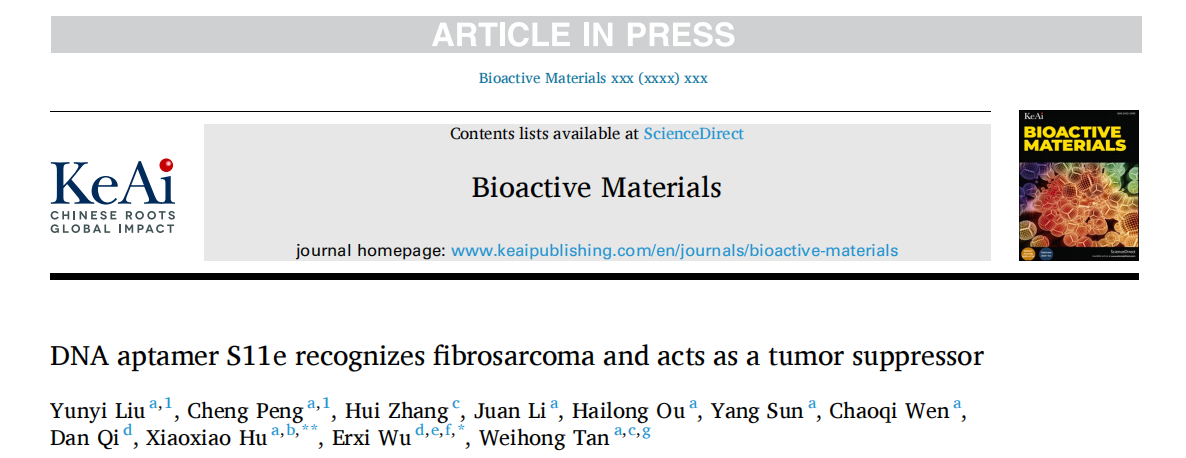 近日,湖南大學胡小曉副教授團隊在綜合性國際學術期刊《Bioactive Materials》上發表了“DNA aptamer S11e recognizes fibrosarcoma and acts as a tumor suppressor”的研究論文,該團隊篩選出了一條能特異性識別纖維肉瘤的核酸適體,確定了其目標功能靶點Diablo/SMAC,并初步揭示了核酸適體S11e促進纖維肉瘤凋亡機制并抑制其遷移和侵襲。