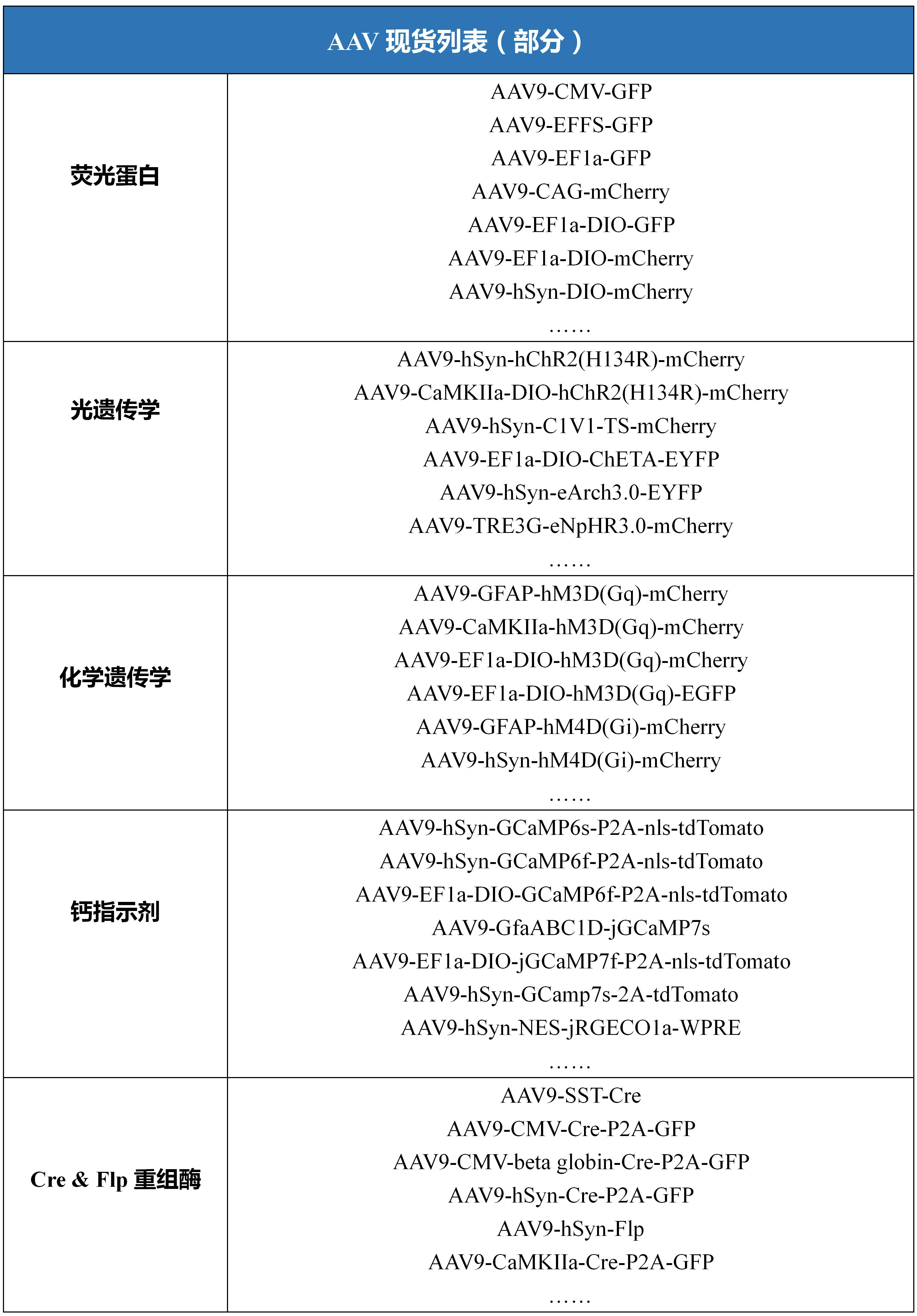 維真AAV系列產品,涵蓋熒光蛋白、光遺傳學、化學遺傳學、鈣指示劑、Cre & Flp重組酶、細胞自噬等,大量現貨,滴度高,發貨快!(點擊藍字檢索感興趣的現貨AAV)