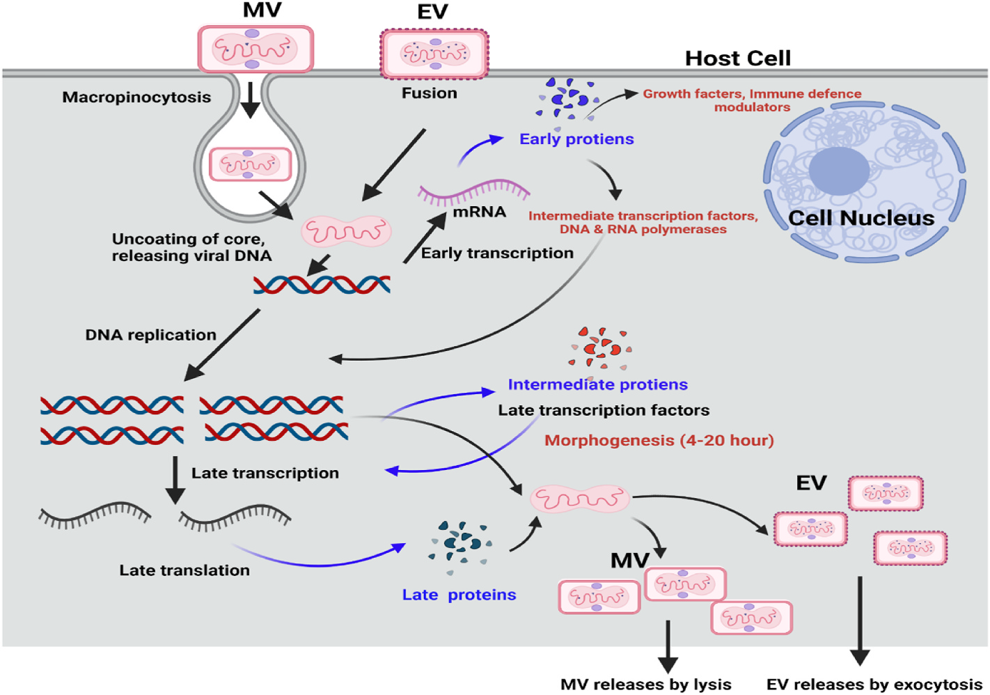 與多數DNA病毒不同,MPV在受感染細胞的細胞質內復制,而非細胞核內。MPV復制過程中產生兩種感染性病毒顆粒:細胞內成熟病毒(MV)和細胞外包膜病毒(EV),其中,MV通過微胞飲或膜融合進入細胞,而EV通過膜融合進入。MV外有一層脂蛋白包膜,包裹病毒核心和包含蛋白質的側體,在外界環境中相對穩定,主要參與介導宿主之間的傳播;EV由脂質膜包裹MV外周形成,它來源于高爾基體或核內體。在胞質內完成病毒DNA的復制和病毒蛋白的組裝后,MV經細胞裂解被釋放,而EV則通過胞吐作用離開細胞。