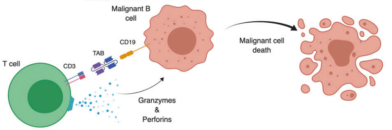 CD3-CD19雙抗不僅是簡單的把T細胞與腫瘤細胞相結合,其通過與T細胞表面CD3受體相結合形成復合物,進一步激活T細胞信號通路,使T細胞表達CD69、CD25,上調細胞黏附分子(CD2)、短暫釋放炎癥因子,令T細胞活化,促使T細胞增殖,進而引起腫瘤細胞溶胞而死亡。