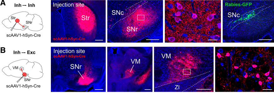 抑制性神經環路中的研究結果見下圖。將scAAV1 - hSyn - Cre注射到紋狀體Str中,Str中含有GABA能棘狀神經元,它可以投射到黑質網狀核SNr中的抑制性細胞。14天后,發現SNr中的神經元被標記;此外,作者還測試了AAV1從SNr中的抑制性神經元擴散到丘腦腹內側核VM中的興奮性神經元的概率,發現VM中也有相當數量的神經元被標記,證明AAV1可以用于抑制性神經元投射順向跨突觸標記不同類型的多種細胞。