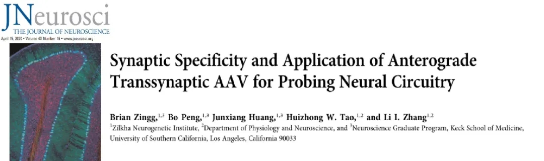 3. Brian Zingg, Bo Peng, Junxiang Huang, Huizhong W. Tao, and Li I. Zhang(2020) Synaptic Specificity and Application of Anterograde Transsynaptic AAV for Probing Neural Circuitry. The Journal of Neuroscience 40 (16): 3250-3267.