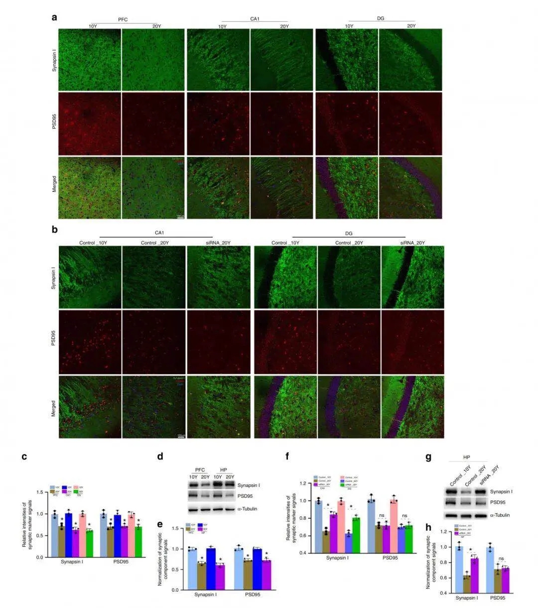 接著,作者從體內外檢測了獼猴腦中幾個突觸組分表達的年齡相關性變化。免疫組織化學結果(見圖6)顯示,與10年齡雄性和雌性獼猴相比,20年齡雄性和雌性獼猴PFC和海馬CA1 & DG區的synapsin-I(突觸前囊泡蛋白)和PSD95(突觸后膜骨架蛋白)表達水平均顯著降低;敲低CircGRIA1顯著增加了20年齡雄性獼猴海馬中synapsin-I的表達水平,而PSD95表達水平幾乎沒有變化。CircGRIA1敲低組的體外結果跟體內結果一致。