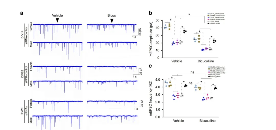 突觸可塑性與谷氨酸受體AMPA和NMDA 介導的神經活動相關。微型自發的興奮性突觸后電流(mEPSCs)用于模擬該神經活動。作者探究了CircGRIA1是否參與突觸可塑性。作者使用慢病毒載體(MOI=5-10)感染DIV5的胎猴海馬神經元,體外操縱CircGRIA1,跟蹤記錄不同時間點的mEPSCs。結果顯示DIV28,control組mEPSCs的振幅和頻率均下降,siRNA感染組則緩解了這種下降。
