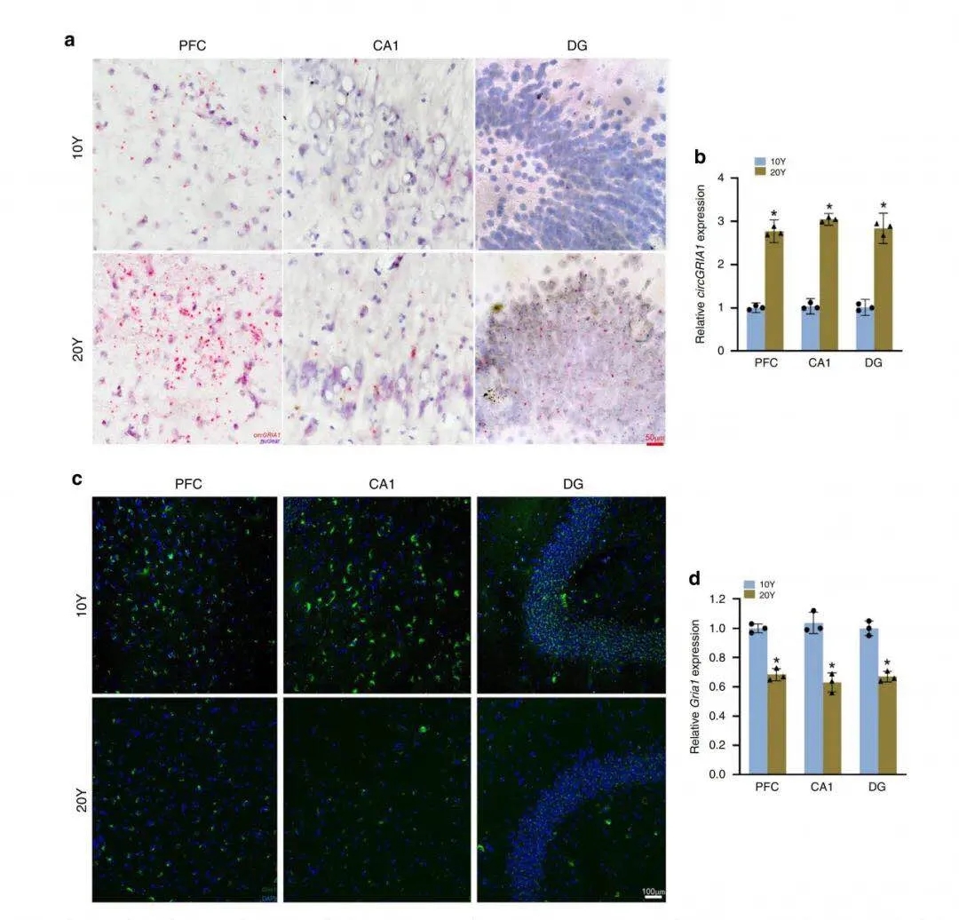 2020年7月,中國科學院昆明動物研究所李家立團隊又在《Nature Communications》(IF=12.121)上發表了題為“CircGRIA1 shows an age-related increase in male macaque brain and regulates synaptic plasticity and synaptogenesis”的研究論文,文章在上述研究工作基礎上發現CircGRIA1的表達在獼猴前額葉皮層和海馬區具有年齡特異性和雄性特異性,并且順式作用于Gria1基因啟動子進而調控Gria1基因的表達;體內外操縱circGRIA1表達能夠負調節Gria1基因的表達,敲低circGRIA1可顯著改善老年雄性獼猴海馬神經元的突觸可塑性及突觸再生。該論文強調了CircRNA調控的重要性,加深了人類對腦衰老生物學的了解。