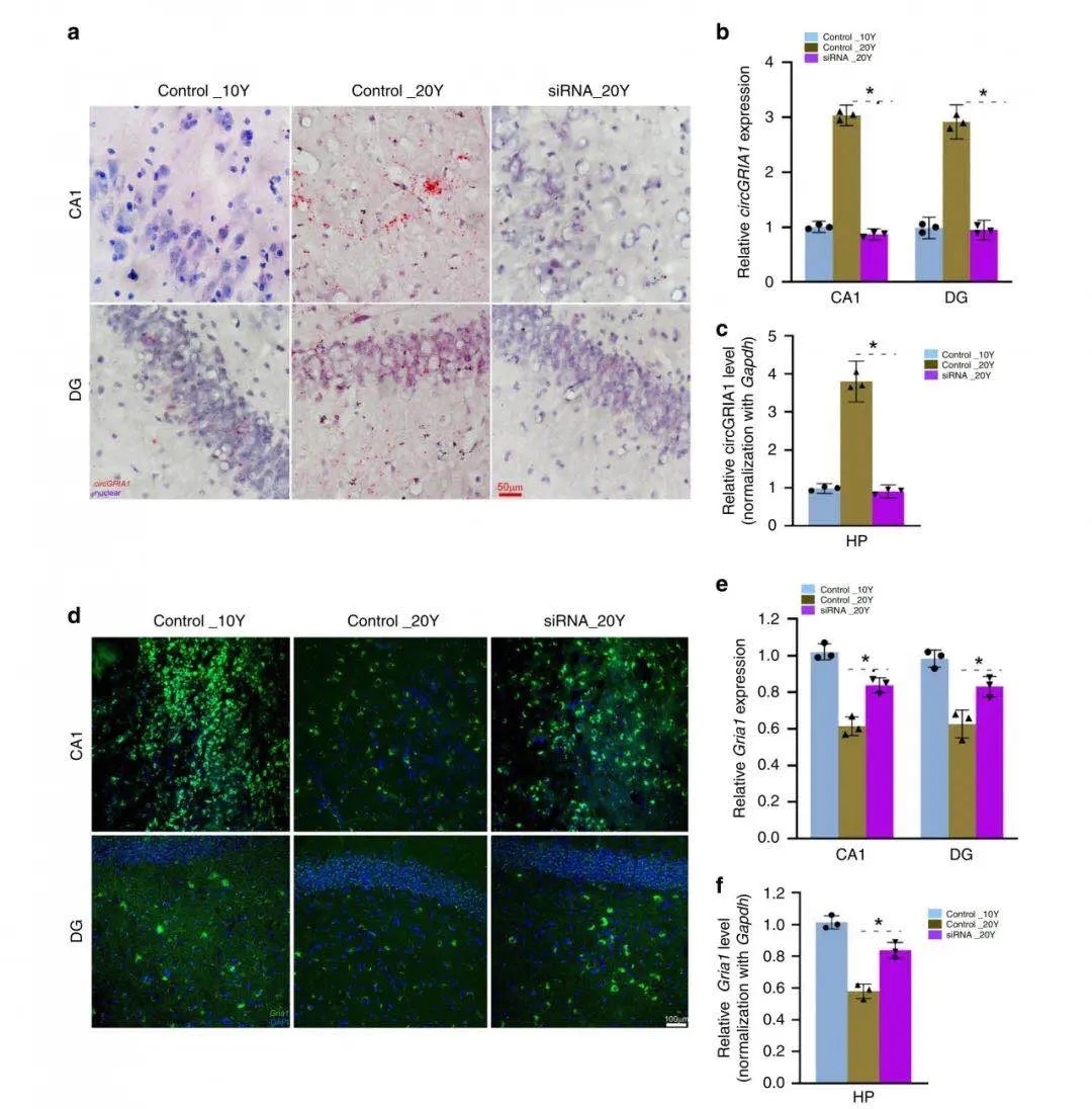接下來,作者探討了CircGRIA1和Gria1表達負相關的生理功能,如是否參與了老化過程中突觸形成前后的調控。首先,作者將AAV9-siRNAs(CircGRIA1)&AAV9-siRNAs(control)病毒顆粒微注射至10年齡和20年齡雄性和雌性獼猴的海馬區,6周后,采用BASEscope ISH、RNAscope ISH和RT-qPCR檢測CircGRIA1和Gria1的表達水平,發現20年齡雄性獼猴海馬中CircGRIA1表達顯著降低,而Gria1 mRNA表達升高。(圖5)