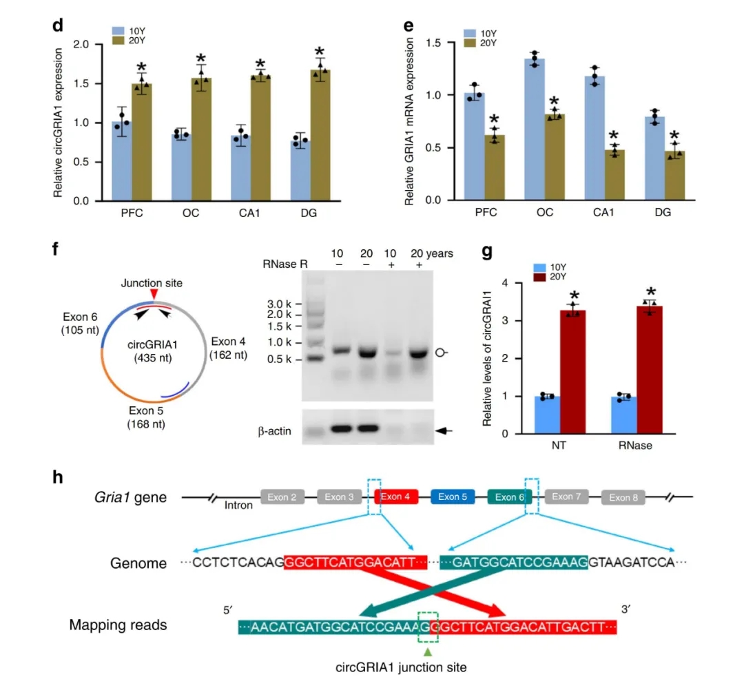 CircGRIA1是由谷氨酸受體AMPA亞基Gria1基因外顯子4,5,6形成的進化保守性circRNA。作者通過qPCR及Northern blot發現CircGRIA1在雄性獼猴腦中呈現增齡性表達升高,且與宿主(Gria1)mRNA表達呈負相關。(圖1)