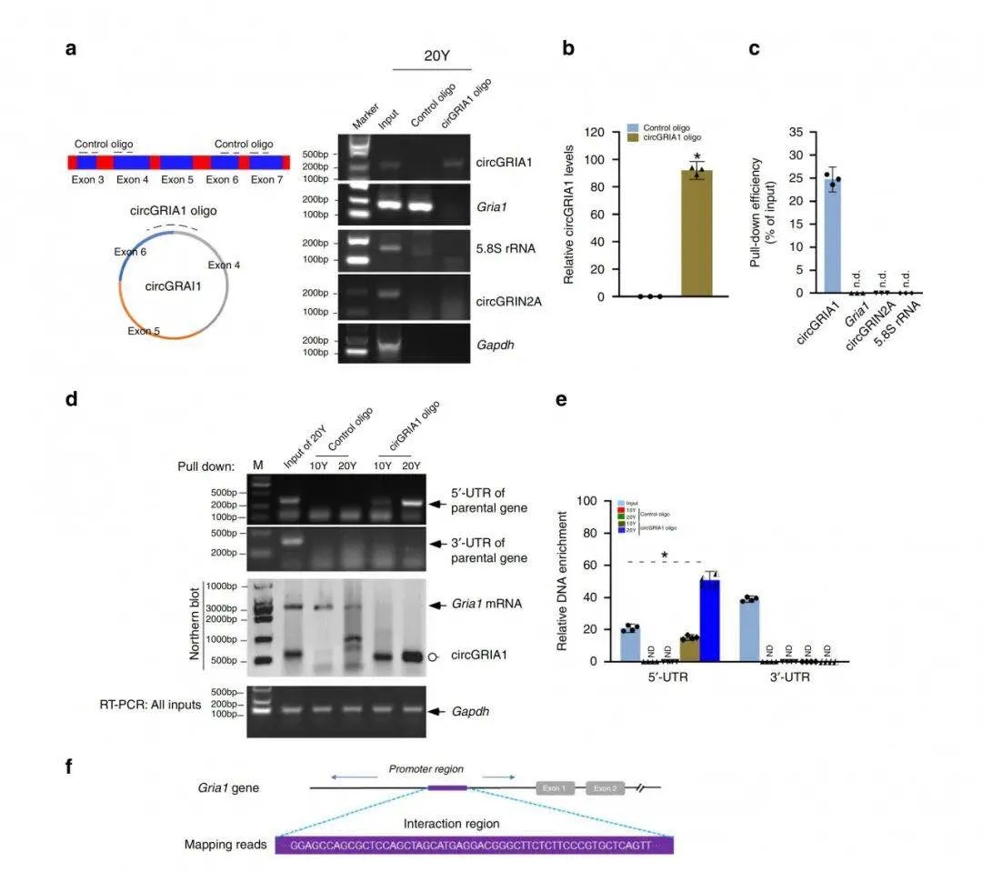 為了探討CircGRIA1與其宿主(Gria1)mRNA表達負相關的分子機制,作者從體內外用ChIRP技術研究了與CircGRIA1反向剪接點共沉淀的片段,發現CircGRIA1結合其宿主(Gria1)mRNA的5’UTR,進而發揮負調控功能。(圖3)