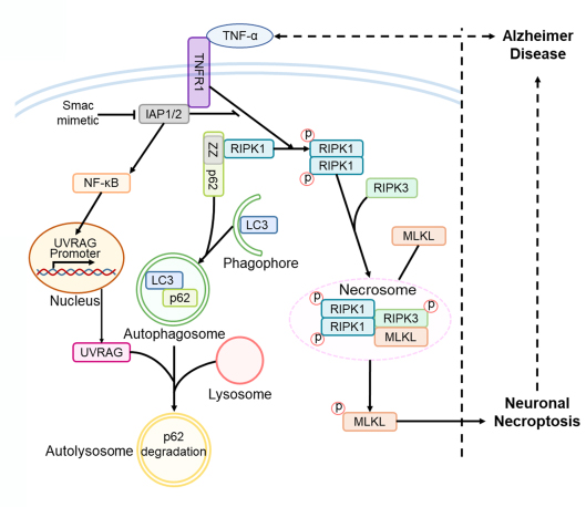 本研究利用來自AD患者的腦組織和AD小鼠模型,通過免疫組織化學 (IHC) 染色和免疫印跡法測定壞死信號通路中關鍵基因的表達,發現TNF-α/TNFR1信號通路在AD神經元壞死激活中發揮作用。在TNF-α刺激下,積累的p62 招募 RIPK1并誘導其自我寡聚,激活下游 RIPK1/RIPK3/MLKL級聯反應,導致神經元壞死。進一步研究發現,p62的異常積累是由TNF-α誘導的UVRAG下調介導的自噬損傷引起的。通過注射AAV載體上調UVRAG的表達,可以抑制 AD細胞和小鼠模型中神經元壞死,并改善認知功能。本研究揭示了AD發病過程中神經元壞死和自噬機制之間的聯系,為AD的臨床干預提供了潛在的靶點,同時也為其他NDs的細胞死亡調節機制的探索提供了基礎。