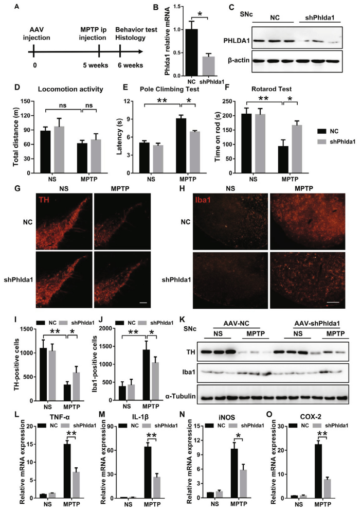 為探究PHLDA1在PD中的作用,研究人員利用AAV介導的shRNA對小鼠體內PHLDA1進行了敲降,5周后檢測發現AAV9-shPhlda1組小鼠,PHLDA蛋白與mRNA水平均顯著下降。感染小鼠給予MPTP誘導PD樣表型,發現抑制PHLDA1的表達無法改善小鼠基礎運動功能,但能顯著減弱MPTP誘導的行為損傷,對ShPhlda1小鼠中腦的TH免疫組化染色和免疫印跡進一步證實了其保護作用,這表明抑制PHLDA1的表達可顯著減輕MPTP所致的多巴胺能神經元和行為損傷。有趣的是,ShPhlda1小鼠SNc中Iba-1(小膠質細胞標志物)陽性細胞數量和總蛋白水平也降低,且ShPhlda1小鼠中炎性因子的表達降低。這些結果表明,SNc中PHLDA1的耗竭保護了DA神經元并抑制了神經炎癥,最終減弱了MPTP誘導的PD樣表型的發展。