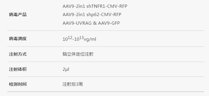 研究人員發現在TNF-α誘導下,p62積累并激活下游 RIPK1/RIPK3/MLKL級聯反應,導致了神經元壞死,而p62的異常積累是由UVRAG下調介導的自噬流受損引起的。為進一步探究UVRAG在AD小鼠神經元壞死中的作用,研究者利用AAV載體在原代神經元中對UVRAG進行了過表達,結果發現UVRAG的過表達明顯降低了TNF-α誘導的MLKL磷酸化。通過在AD小鼠海馬區注射AAV-UVRAG,發現p62與MLKL的磷酸化水平均顯著降低。此外,UVRAG的過表達明顯改善了AD小鼠的學習和記憶功能障礙。以上結果表明,上調UVRAG可抑制AD小鼠神經元壞死并改善認知功能,提示UVRAG可能是AD干預的潛在靶點。