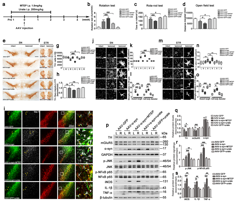 為確定mGluR5在α-syn誘導的體內小膠質細胞激活中的功能作用,作者利用AAV9-α-syn誘導PD大鼠模型,并對其進行行為評估及病理生理學分析,發現α-syn過表達組從第8周至第16周出現顯著的進行性功能障礙,且過表達α-syn,能導致mGluR5表達降低,同時TH表達改變;此外小膠質細胞中的炎性因子iNOS、IL-1β和TNF-α的表達水平在注射后10天開始升高,4周時達到峰值,8周后影響消失,這說明在PD的發病早期伴隨著反應性小膠質細胞的高度局部炎癥反應。為進一步確定炎癥干預在PD早期的作用,作者在第4周炎癥高峰期時利用MEPT(mGluR5拮抗劑)或尿酸鹽處理,結果發現MEPT處理阻斷了mGluR5的活性并加劇了炎癥反應,而尿鹽酸處理減緩了炎癥反應。綜上,在AAV-α-syn誘導的PD模型中,mGluR5的激活在介導神經保護的抗炎反應中起著關鍵作用。