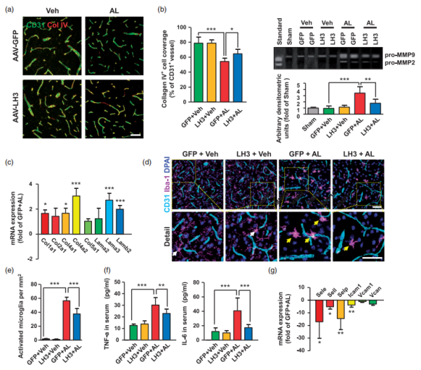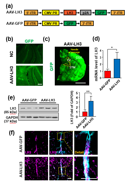 首先(xian),研究(jiu)者(zhe)利(li)用AAV9- Plod3轉基(ji)因的病毒載體(ti),通過立體(ti)定位(wei)注(zhu)射(she)的方法將病毒注(zhu)射(she)入小鼠側腦(nao)(nao)室,4周后(hou)檢測病毒感染情況及LH3在腦(nao)(nao)血管(guan)的表達(da)情況。結果如圖一所示,通過腦(nao)(nao)整體(ti)切片檢測綠色(se)熒光蛋(dan)白,提(ti)取腦(nao)(nao)血管(guan)蛋(dan)白進行(xing)Western Blot以及免疫熒光多重方法檢測,確(que)認了LH3基(ji)因確(que)實在小鼠全腦(nao)(nao)中的過表達(da)。立體(ti)定位(wei)注(zhu)射(she)分(fen)位(wei)置(zhi)為(wei)前囟(xin)點后(hou)退0.2mm旁開(kai)1mm深2.7mm,注(zhu)射(she)病毒體(ti)積為(wei)2μL。