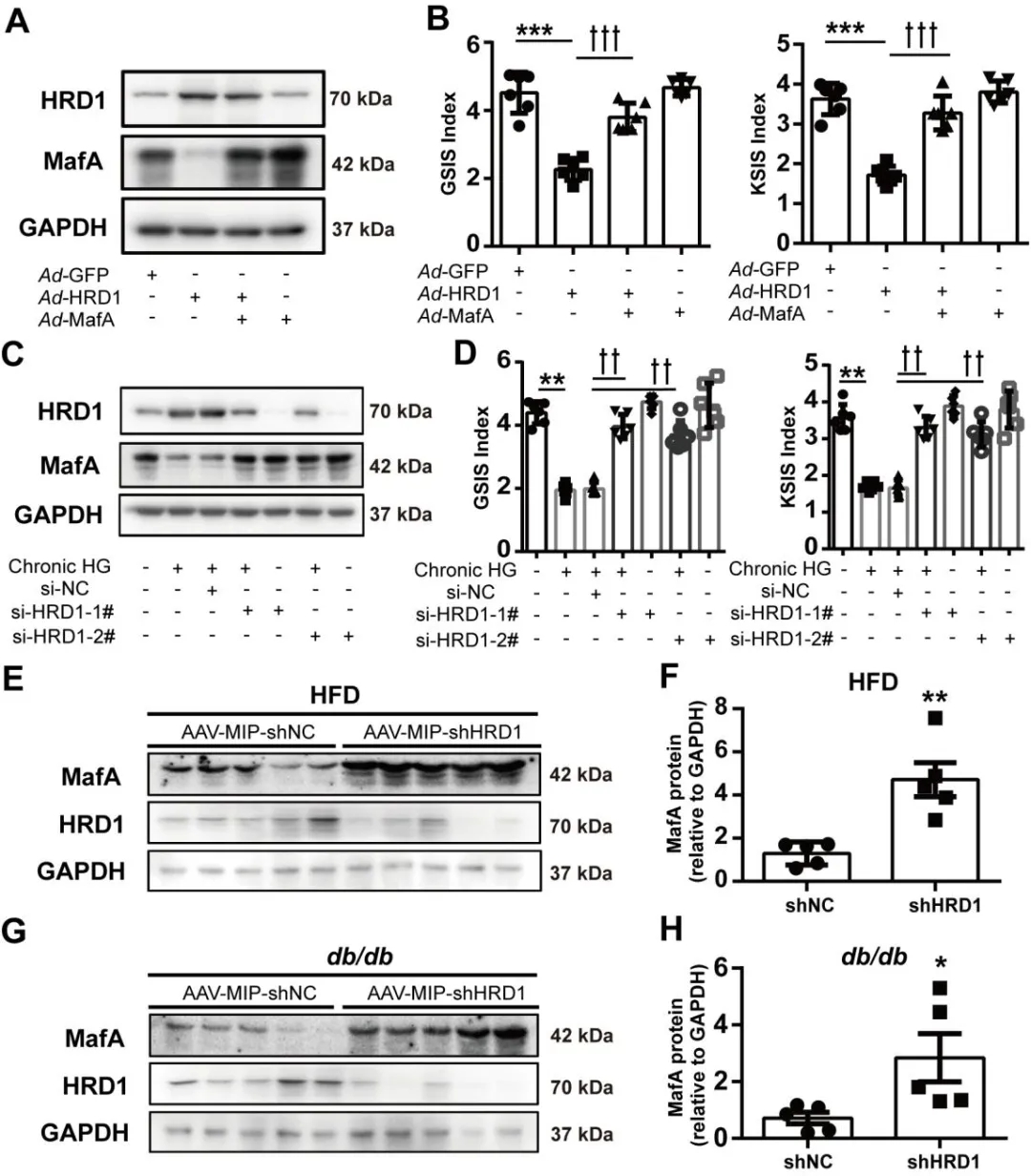 作者(zhe)研(yan)究發(fa)現單獨感染(ran)Ad-HRD1的(de)小鼠(shu)胰(yi)島(dao)和(he)(he)MIN6細胞(bao),胰(yi)島(dao)素(su)分泌明(ming)顯被抑(yi)制,這種(zhong)抑(yi)制可通(tong)過補充MafA得以恢復(fu)(fu)。敲(qiao)除HRD1可有(you)效減輕(qing)因暴露于慢性高(gao)糖環境而導致的(de)小鼠(shu)胰(yi)島(dao)和(he)(he)MIN6細胞(bao)MafA的(de)減少。小鼠(shu)胰(yi)島(dao)細胞(bao)和(he)(he)長期(qi)暴露高(gao)糖環境的(de)MIN6細胞(bao)HRD1敲(qiao)除后(hou),葡萄糖或(huo)KCL刺激的(de)胰(yi)島(dao)素(su)分泌也(ye)(ye)得到了恢復(fu)(fu)。HFD飼喂的(de)小鼠(shu)和(he)(he)db/db小鼠(shu),AAV-shHRD1注射4周后(hou),胰(yi)島(dao)MafA表(biao)達(da)(da)水平也(ye)(ye)出(chu)現反(fan)彈。綜(zong)上所述,HRD1高(gao)表(biao)達(da)(da)通(tong)過下調MafA使β細胞(bao)發(fa)生功能障(zhang)礙。