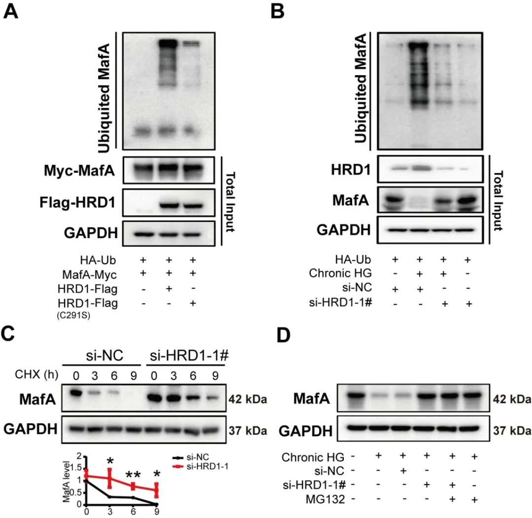 HRD1泛(fan)素(su)(su)連接酶的(de)(de)(de)活性(xing)離不開其Ring環域內的(de)(de)(de)第(di)291位(wei)半胱(guang)氨酸(suan),作者測量了(le)HRD1- WT及(ji)C291S突變體HRD1 (HRD1- C291S)對(dui)MafA泛(fan)素(su)(su)化(hua)(hua)的(de)(de)(de)影響,發(fa)現HRD1- WT過表達顯(xian)著增加MafA泛(fan)素(su)(su)化(hua)(hua);HRD1下(xia)調可顯(xian)著降低慢性(xing)高糖處理MIN6細胞MafA的(de)(de)(de)泛(fan)素(su)(su)化(hua)(hua),HRD1的(de)(de)(de)缺失抑制高糖環境下(xia)MafA蛋(dan)(dan)白的(de)(de)(de)快速(su)降解(jie),并恢復MIN6細胞總MafA蛋(dan)(dan)白的(de)(de)(de)下(xia)降。上述結(jie)果表明(ming)HRD1是E3泛(fan)素(su)(su)連接酶,其作用(yong)是負責MafA的(de)(de)(de)泛(fan)素(su)(su)化(hua)(hua)和降解(jie)。