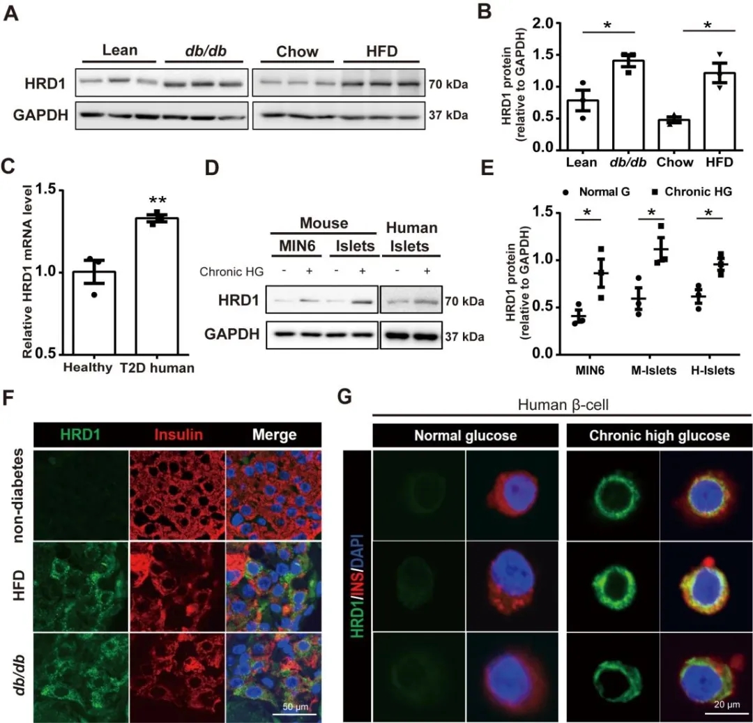 通過Western blot、qRT-PCR和免疫熒光染色方法,作者(zhe)發現:① db/db和HFD飼料喂養的(de)糖尿病(bing)(bing)小(xiao)鼠胰(yi)(yi)島中HRD1顯著上調;② T2D患者(zhe)分離(li)的(de)胰(yi)(yi)島也得(de)到了(le)類似的(de)結果;③db/db和HFD飼喂的(de)小(xiao)鼠胰(yi)(yi)腺(xian)β細(xi)(xi)胞(bao)(bao)內質網(wang)HRD1顯著升高(gao)(gao),伴隨胰(yi)(yi)島素水平的(de)顯著降低(di);④ 長(chang)期暴露(lu)于高(gao)(gao)糖環境的(de)人(ren)及(ji)小(xiao)鼠胰(yi)(yi)島細(xi)(xi)胞(bao)(bao)HRD1表(biao)達較(jiao)正(zheng)常組(zu)明(ming)顯上調;⑤ 在(zai)慢性高(gao)(gao)糖處理的(de)人(ren)胰(yi)(yi)島初(chu)級β細(xi)(xi)胞(bao)(bao)中HRD1表(biao)達增(zeng)強。綜上所(suo)述,糖尿病(bing)(bing)人(ren)及(ji)小(xiao)鼠胰(yi)(yi)腺(xian)β細(xi)(xi)胞(bao)(bao)HRD1表(biao)達水平升高(gao)(gao),可能與β細(xi)(xi)胞(bao)(bao)的(de)衰竭和糖尿病(bing)(bing)的(de)發生有(you)關。